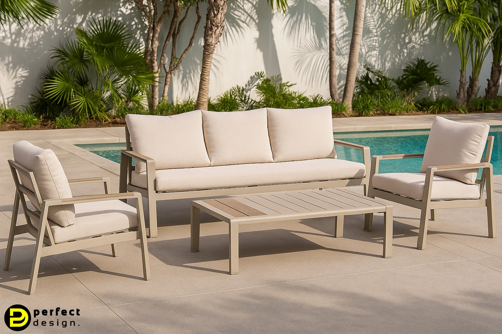 A Captiva szett bézs árnyalatban egy igazán visszafogott, mégis stílusos megoldás. Letisztult formavilága és kényelmes párnázata modern eleganciát visz bármelyik kültéri térbe. A lágy színek és az időjárásálló anyaghasználat együttese ideálissá teszi hosszú nyári pihenésekhez, akár teraszon, akár kertben.