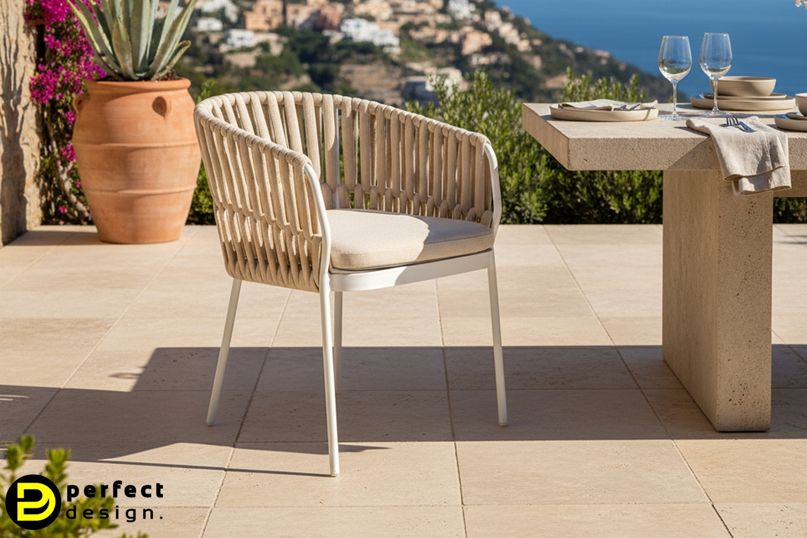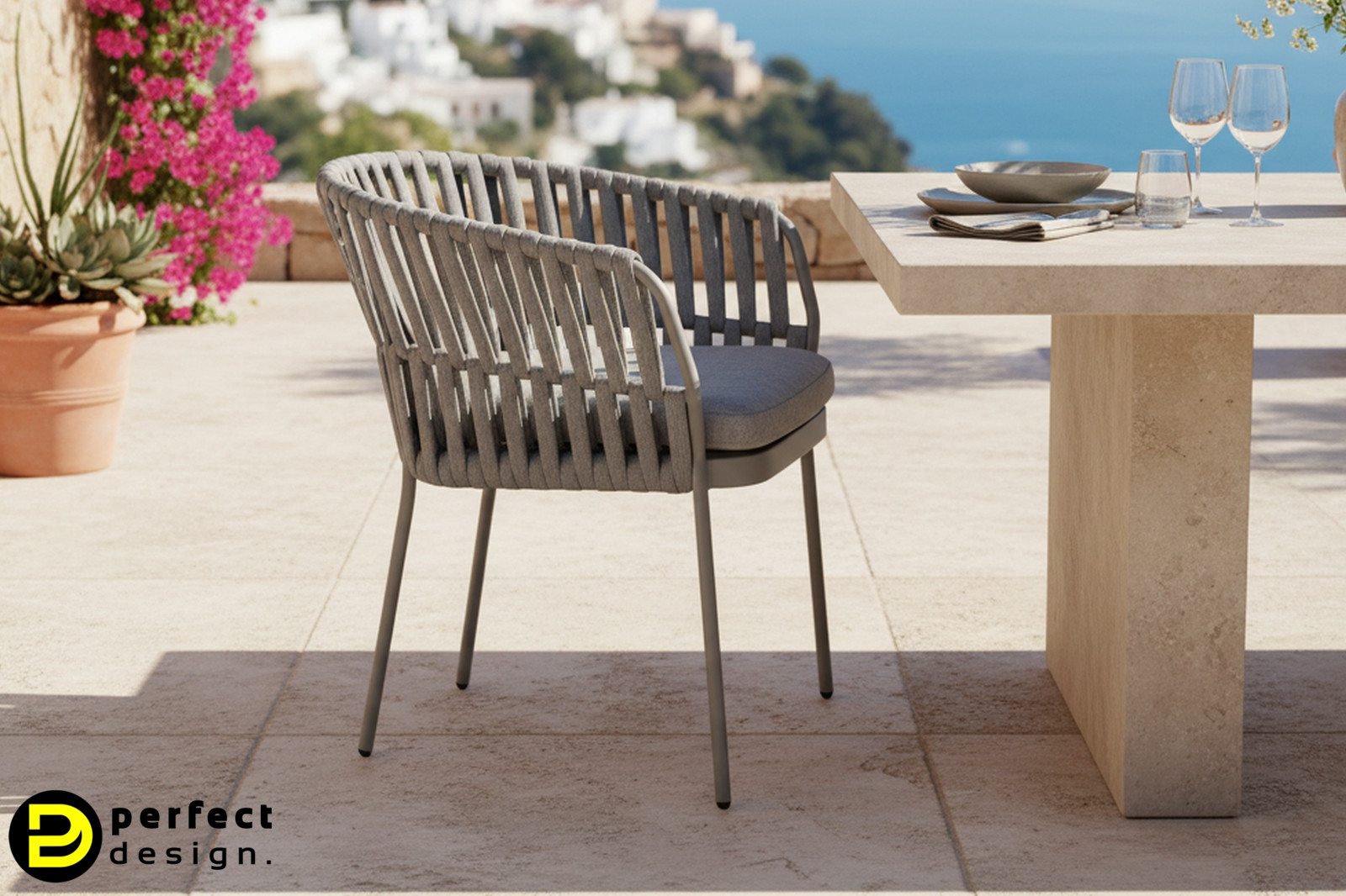 Az AMALFI szék olasz tervezésű, prémium minőségű kerti bútor. A magas minőségű textilénnel bevont párnák rendkívül tartósak, ellenállnak az UV-sugárzásnak és víztaszítóak. A székek háttámlája poliolefin kötélből készült, vázuk alumínium. A bútor exkluzivitását  a minőségi anyaghasználat és az egyedi formaterv párosa adja.