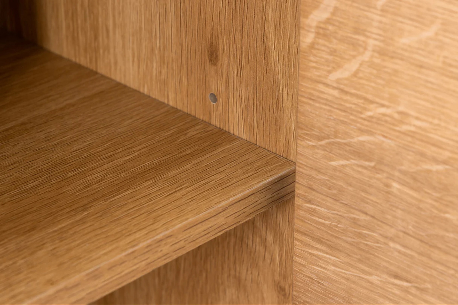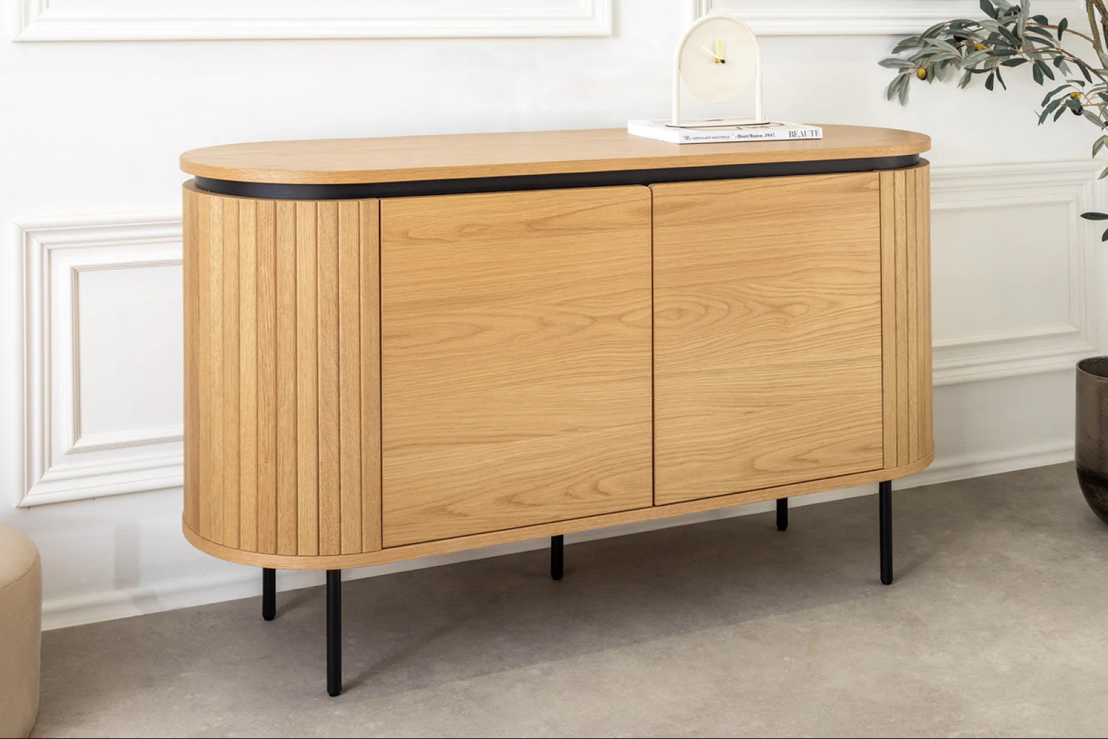 Az ATELIER komód a modern letisztultság és a skandináv elegancia mesterműve. A természetes tölgy furnér meleg tónusa nyugalmat sugároz, míg a fekete színű fém lábak dinamikus kontrasztot adnak, amely karaktert visz a nappaliba. A bútor különlegességét a lekerekített sarkok lágy vonalai, az oldalsó felületeken megjelenő elegáns bordázottság és a fedlap alatt végigfutó fekete szegély adják, amelyek kifinomult kontrasztot teremtenek. Mindez harmonikus, modern összhatást eredményez, amely egyszerre stílusos és időtálló megoldás nappalikba.