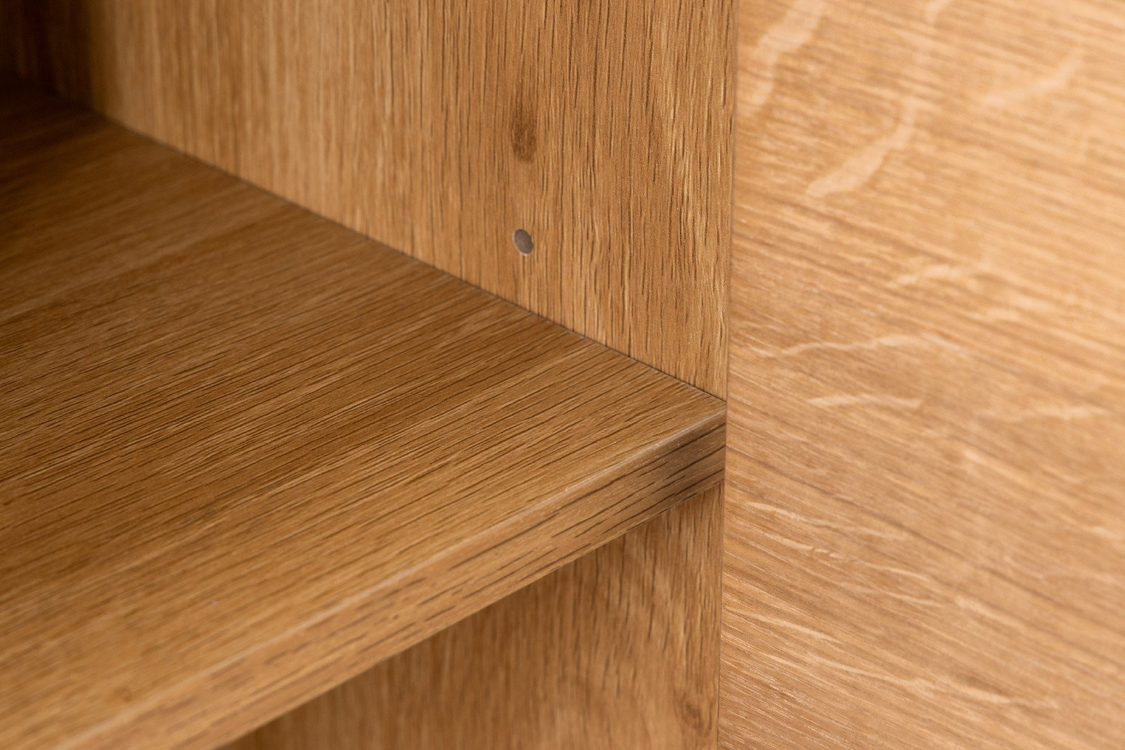 Az ATELIER komód a modern letisztultság és a skandináv elegancia mesterműve. A természetes tölgy furnér meleg tónusa nyugalmat sugároz, míg a fekete színű fém lábak dinamikus kontrasztot adnak, amely karaktert visz a nappaliba. A bútor különlegességét a lekerekített sarkok lágy vonalai, az oldalsó felületeken megjelenő elegáns bordázottság és a fedlap alatt végigfutó fekete szegély adják, amelyek kifinomult kontrasztot teremtenek. Mindez harmonikus, modern összhatást eredményez, amely egyszerre stílusos és időtálló megoldás nappalikba.