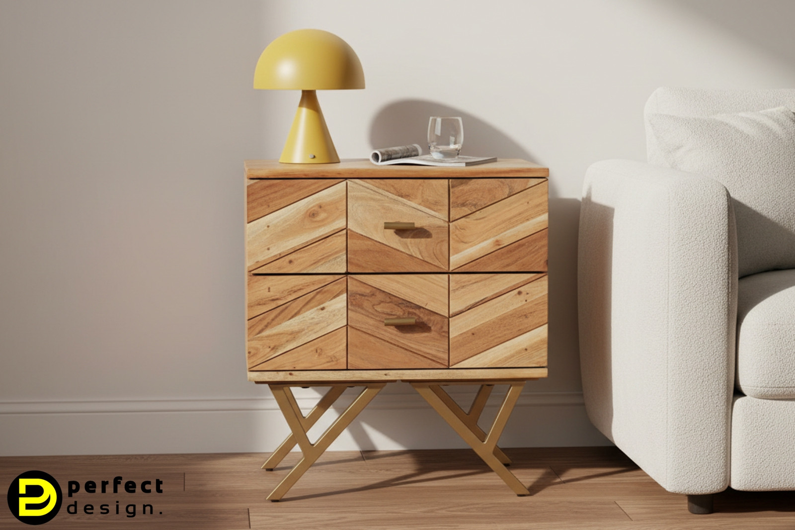 A CLASS éjjeliszekrény modern és trendi kiegészítője lehet otthonának. A gyönyörű akácfából készült bútor frontját halszálka mintázatban kirakott fa elemek díszítik. Az arany színű fogantyúk és lábak eleganciát kölcsönöznek a bútordarabnak.