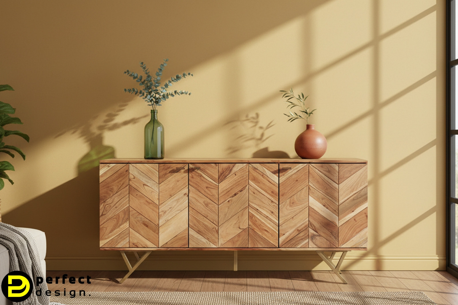 A CLASS komód modern és trendi kiegészítője lehet otthonának. A gyönyörű akácfából készült bútor frontját halszálka mintázatban kirakott fa elemek díszítik. Az arany színű fogantyúk és lábak eleganciát kölcsönöznek a bútordarabnak.