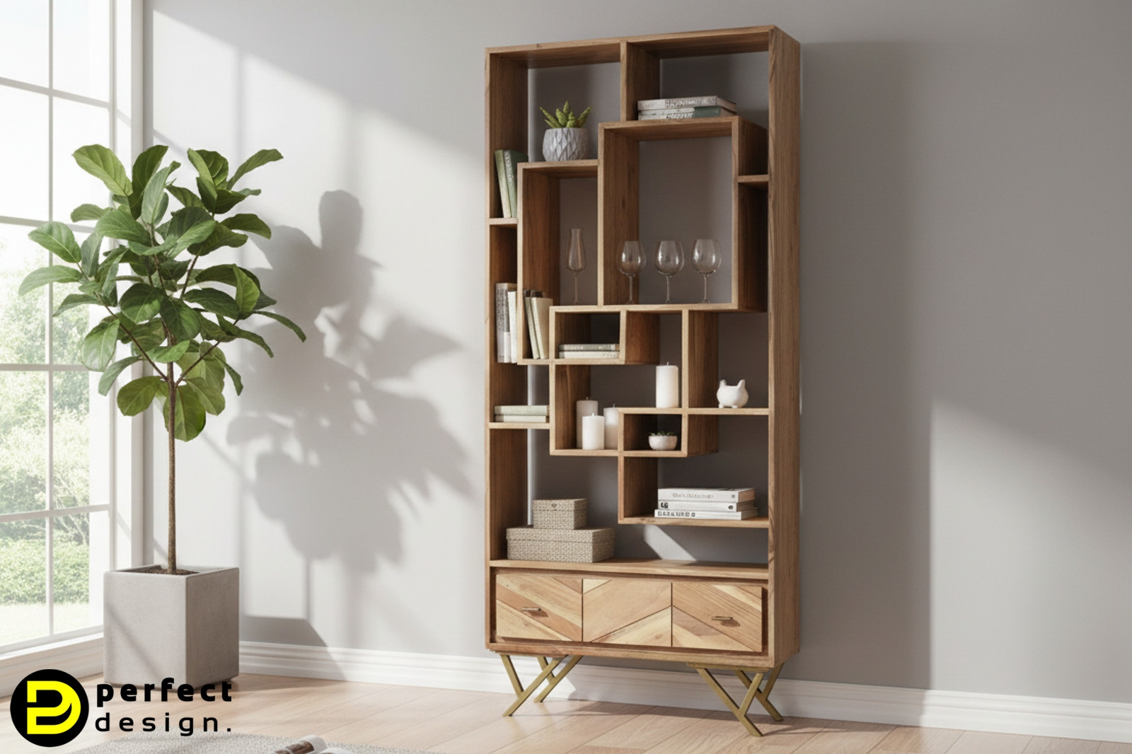 A CLASS polc modern és trendi kiegészítője lehet otthonának. A gyönyörű akácfából készült bútor fiókját halszálka mintázatban kirakott fa elemek díszítik. Az arany színű fogantyúk és lábak eleganciát kölcsönöznek a bútordarabnak. A bútor különlegessége az egymásba érő négyzetekből kialakított polcrendszer. Látványos dísze lehet bármely otthonnak.
