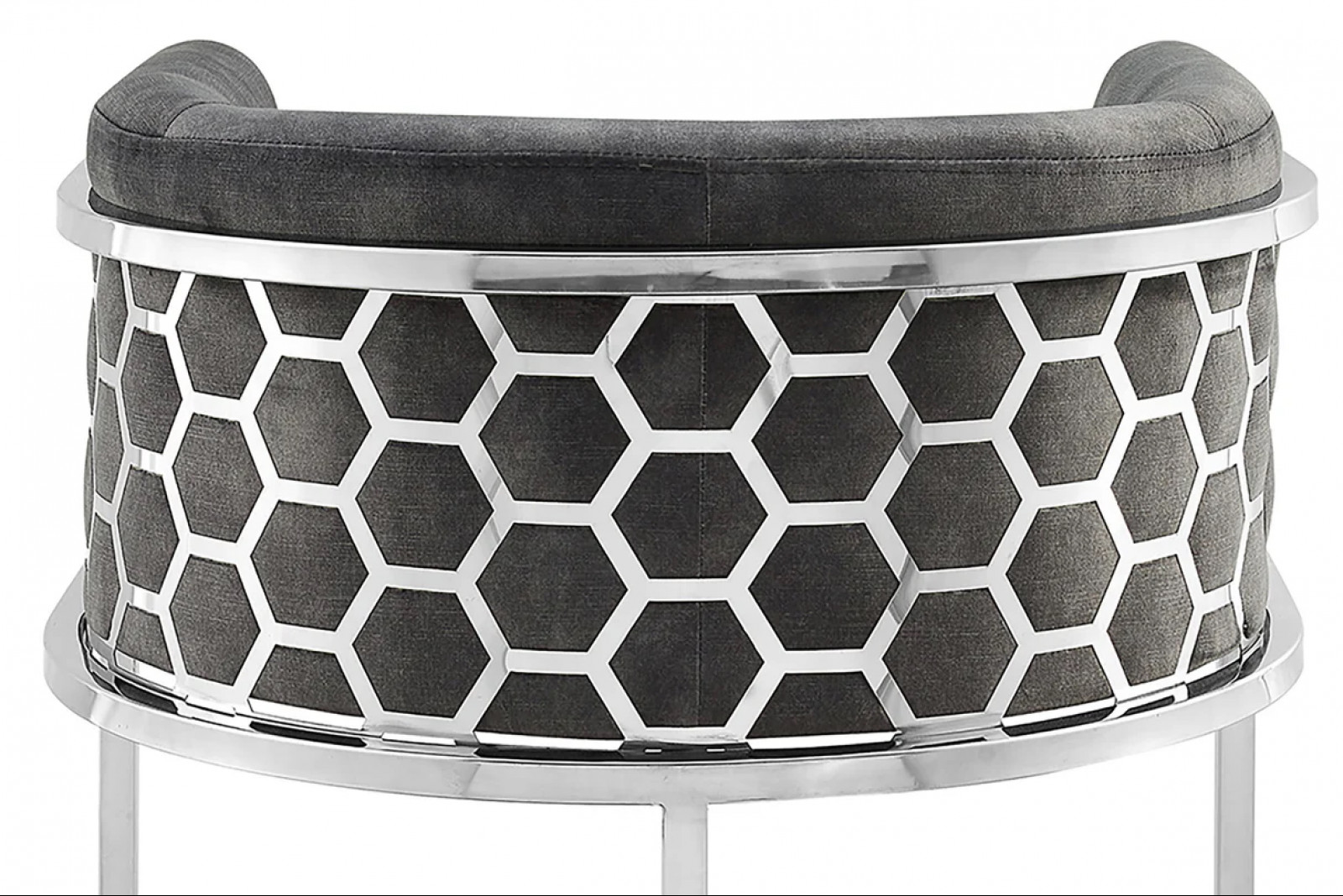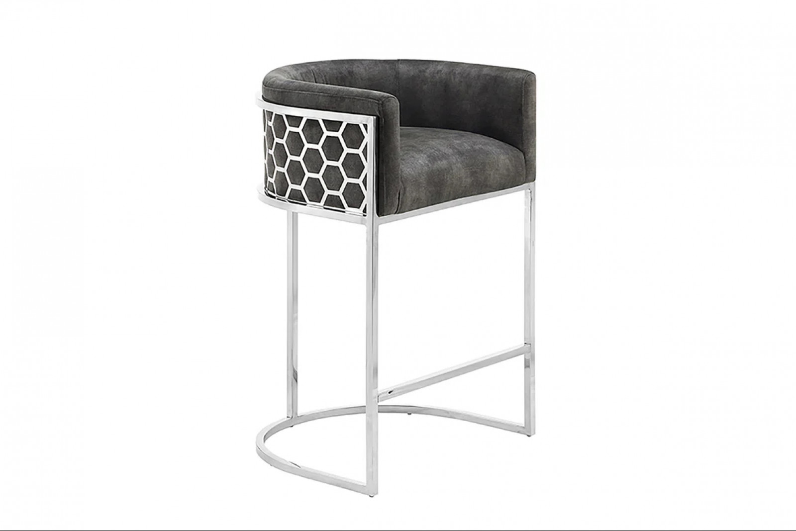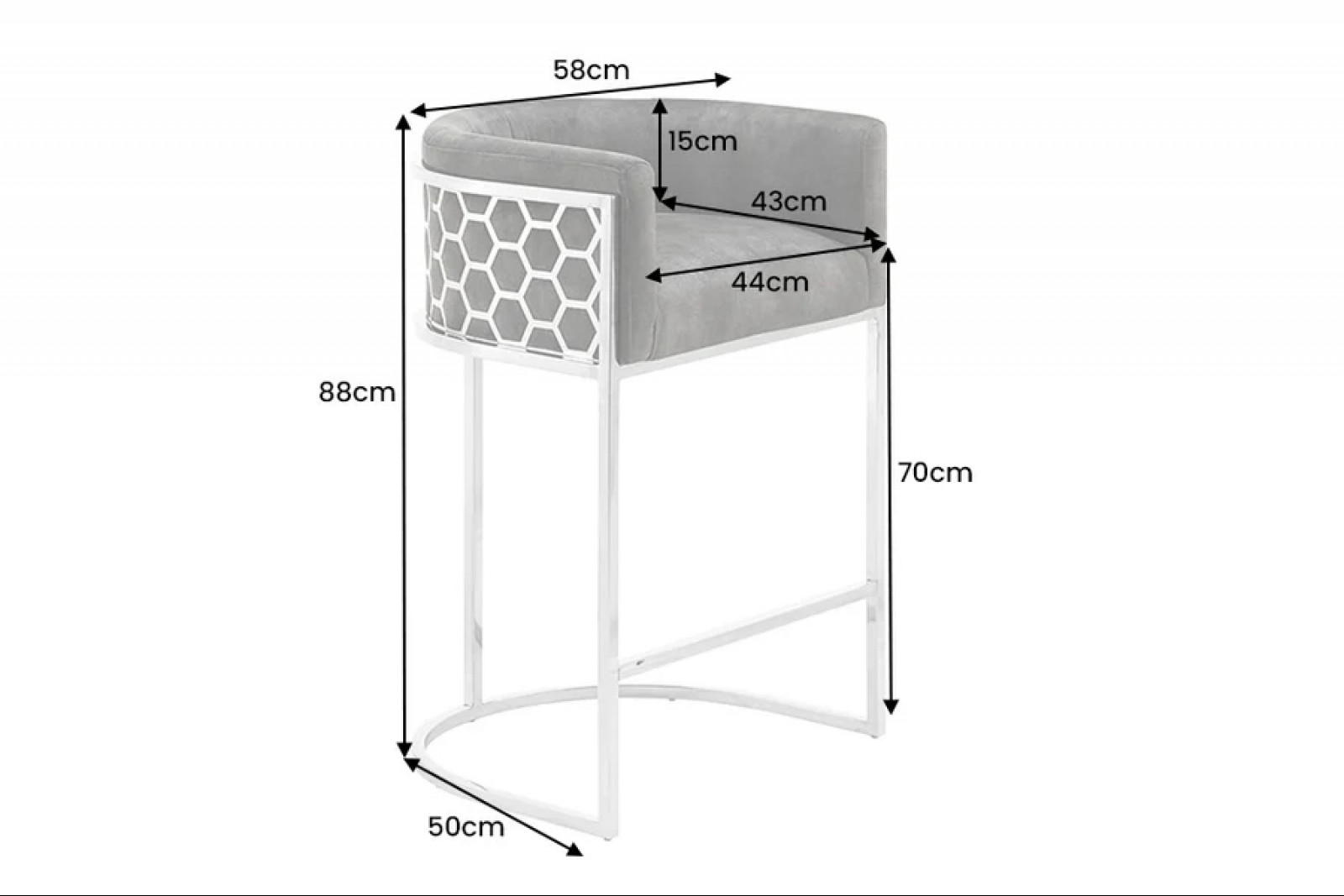 Az ELEGANZA bárszék a kifinomult formavilág és a modern luxus találkozása. A puha, szürke bársony selymes tapintása és elegáns fénye azonnal emeli a tér hangulatát. A rozsdamentes acél lábak és karfák ezüstösen csillogó felülete könnyed kontrasztot alkot a textil mély tónusával, miközben stabilitást és nemes megjelenést biztosít.