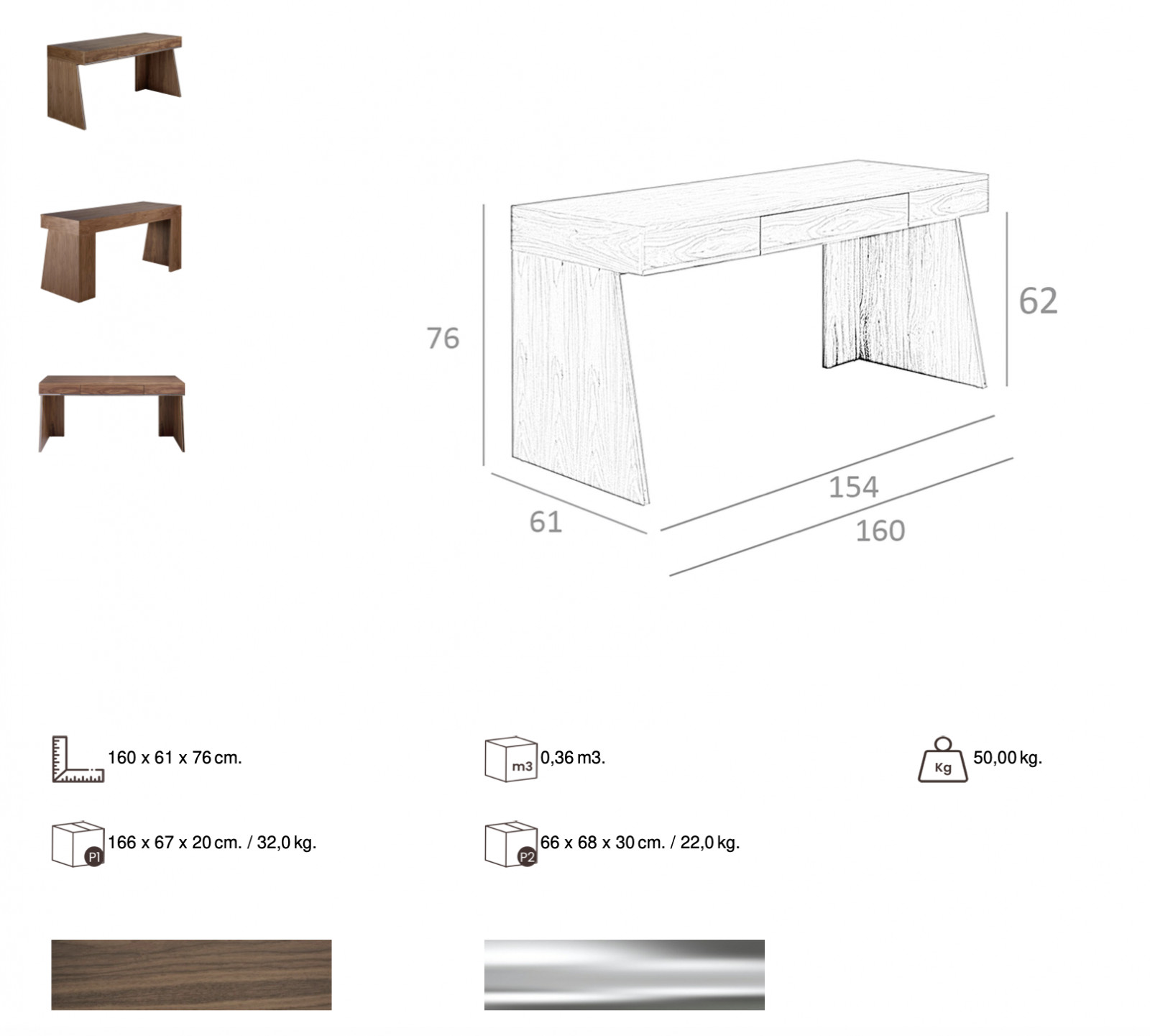 Az ESQUINA íróasztalból sugárzik az elegancia és a luxus. A gondos tervezés, minőségi anyaghasználat és a precíz kivitelezés azonnal szembetűnik az asztalon. A gyönyörű mintázatú diófával furnérozott asztalt különleges szögletes kialakítású láb támasztja alá, praktikus fiókjainak köszönhetően, bármely otthon vagy iroda káprázatos és hasznos dísze lehet.