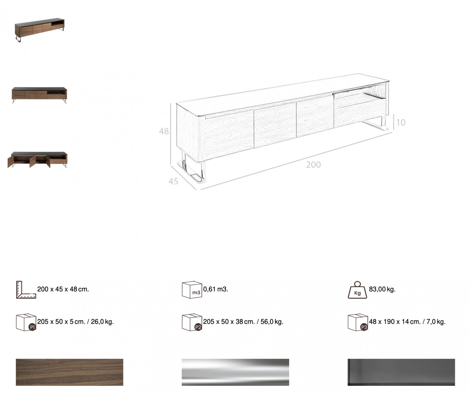 A FERRANO TV-szekrény exkluzív és elegáns. A gyönyörű diófával borított szekrény tetejét biztonsági üveggel borították a tervezők, lábai pedig egyedi kialakítású rozsdamentes acélból készültek. Modern és klasszikus környezetbe egyaránt jól beilleszthető ez a szemet gyönyörködtető bútordarab. 200cm- es méretének, rekeszeinek és fiókjainak köszönhetően praktikus tárolást biztosít. Kínálatunkban megtalálható a hozzá illő komód is