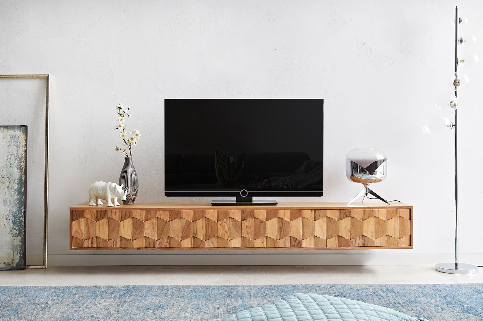 A FEVON TV-szekrény káprázatos bútordarab. A csodás mintázatú akácfából készült szekrény frontja három dimenziós kialakítású. Falra függeszthető kivitelének köszönhetően olyan, mintha lebegne a térben.