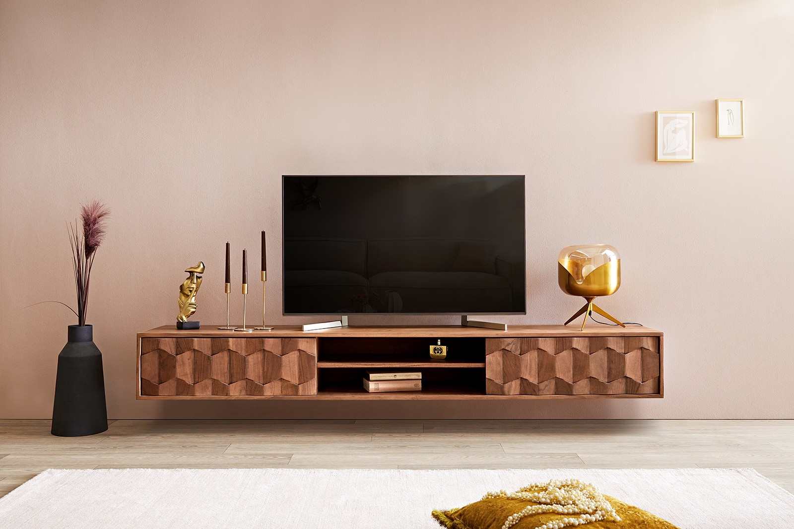 A FEVON TV-szekrény káprázatos bútordarab. A csodás mintázatú akácfából készült szekrény frontja három dimenziós kialakítású. Falra függeszthető kivitelének köszönhetően olyan akár lebegne a térben.