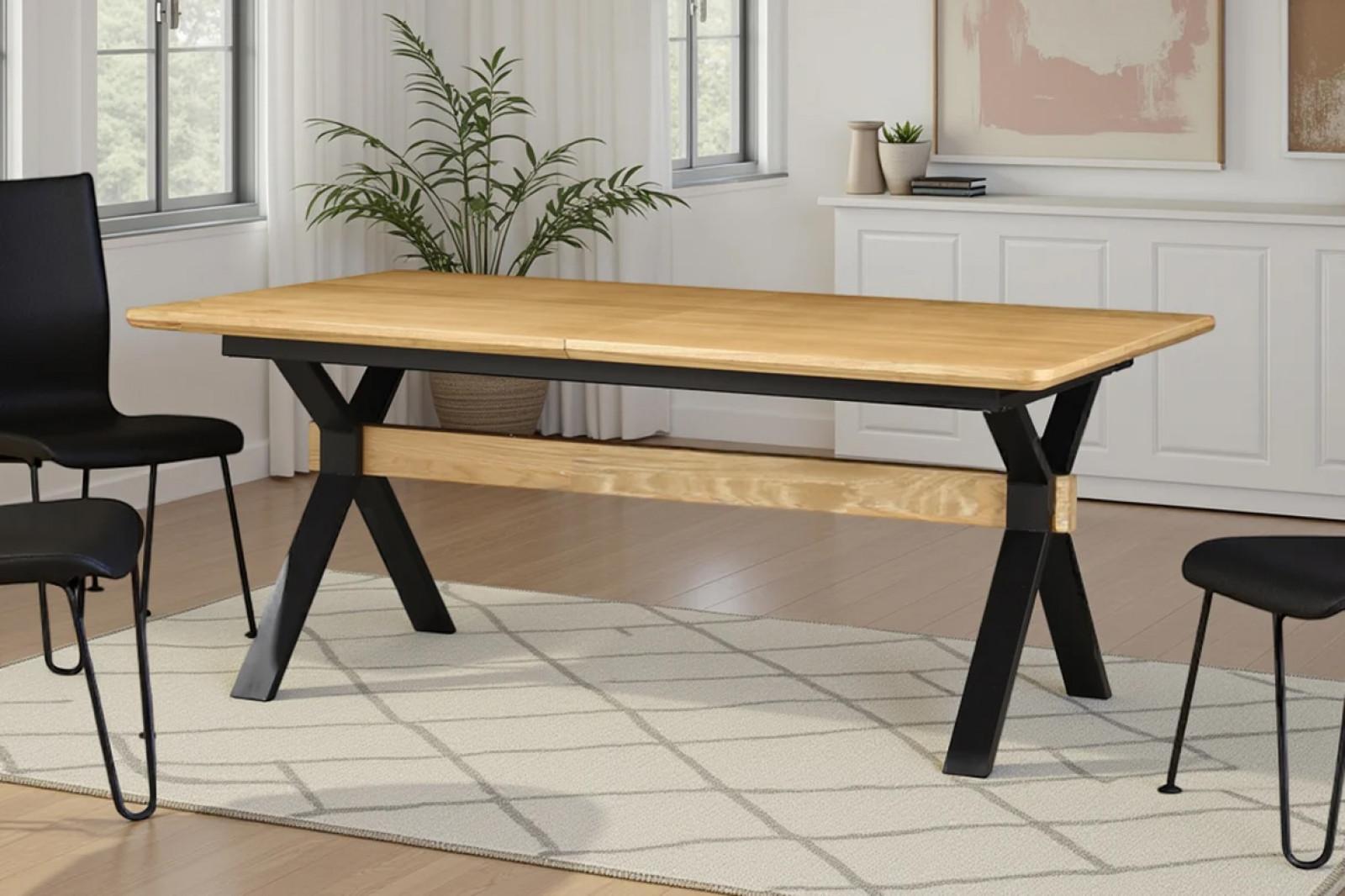 A karakteres X-lábazat matt fekete fém kivitelben vizuális dinamikát kölcsönöz az asztalnak — erős tartást ad, miközben a lábak keresztbe futó szerkezete elegáns kontrasztot alkot a fa melegségével. Ez a darab stílusos, masszív és mindig központi eleme lesz a térnek.
