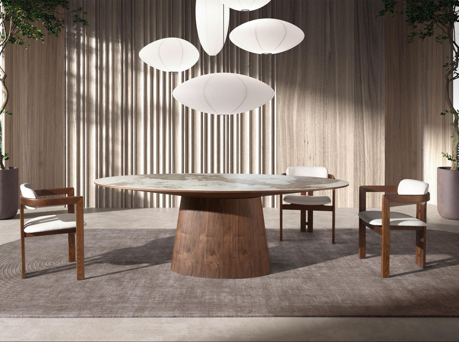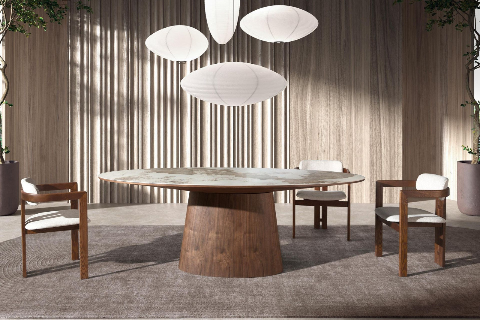 A diófa furnérral borított, félkörívben hajlított láb szoborszerűen emeli ki az asztal karakterét. A forma egyszerre modern és időtlen – a lágy ívek és a természetes anyagok kombinációja melegséget, stabilitást és eleganciát sugároz.