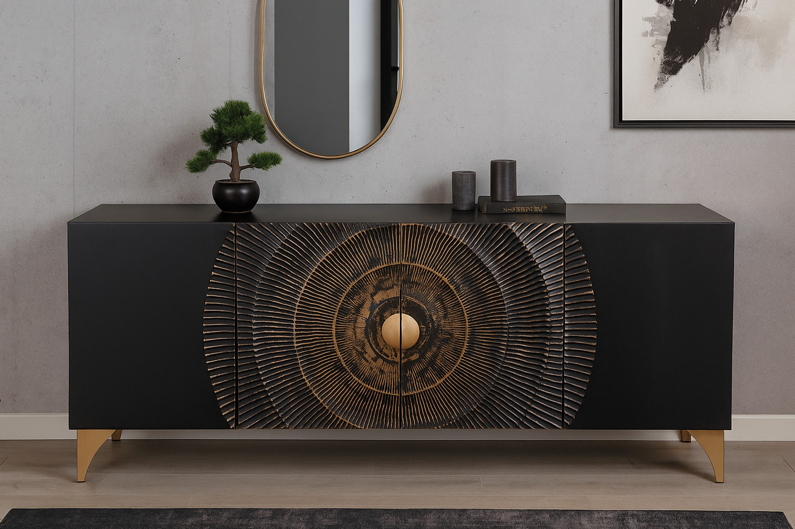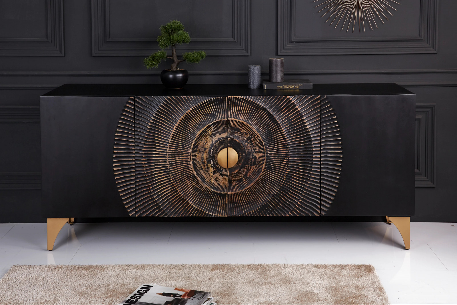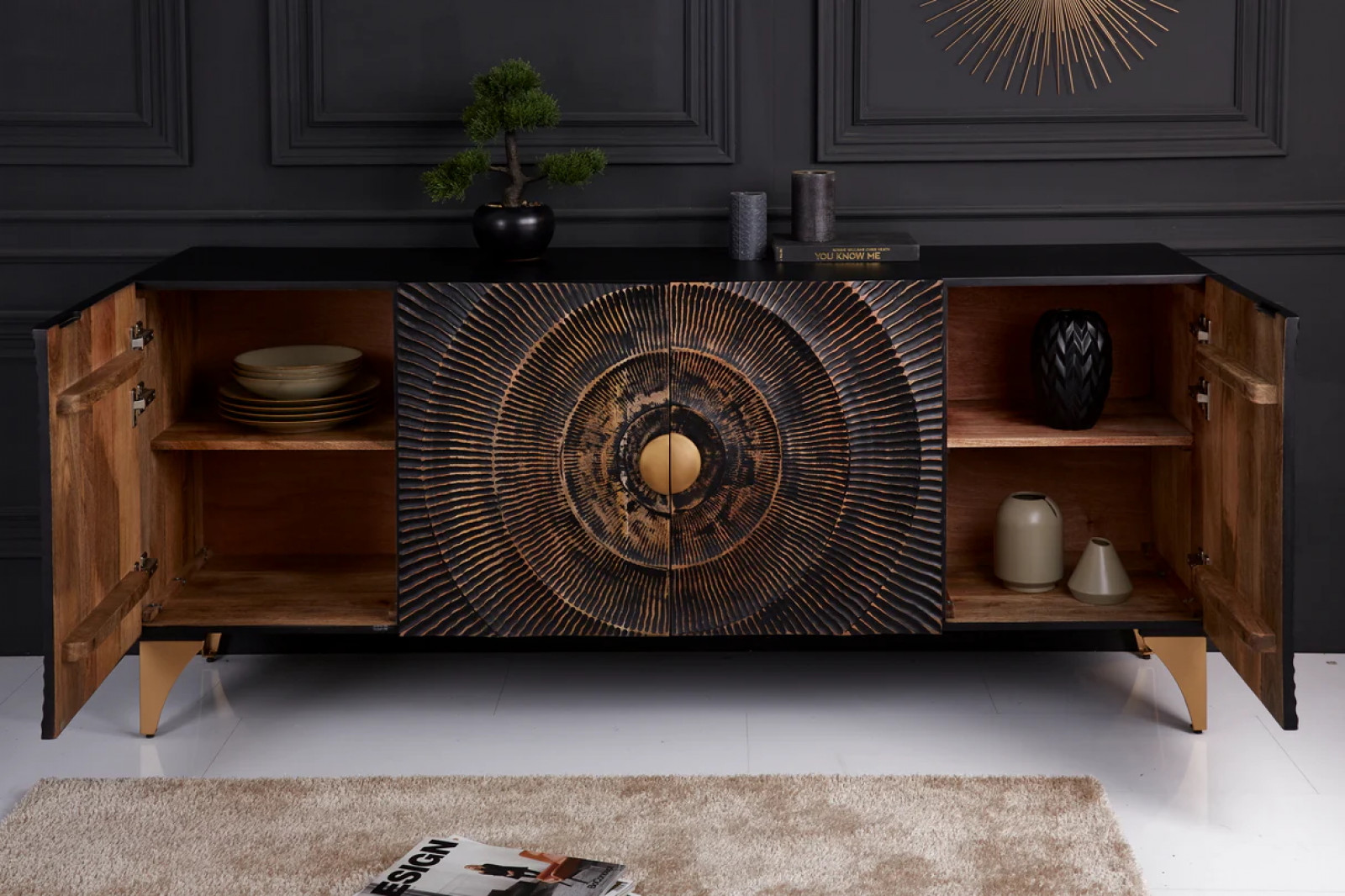 A GOLDEN SUNSET komód teljesen egyedi és káprázatos bútordarab. A szekrény korpusza tömör mangófából készült, frontját különleges mintázatú, a lemenő napot mintázó arany színű bemarás díszíti Ha szeretne egy olyan kortárs darabot ami sosem megy ki a divatból, és nap mint nap szeretne gyönyörködni a természet alkotta csodában, akkor remek választás ez a komód.