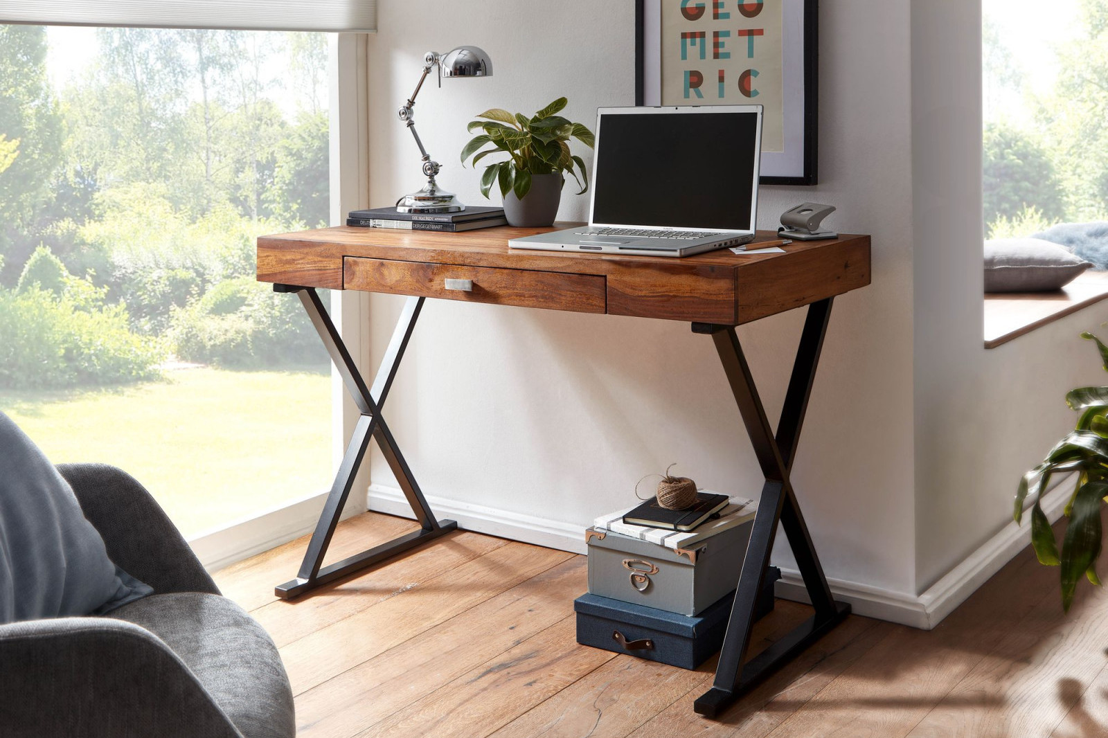 A fekete fém lábak X-alakú szerkezete dinamikus megjelenést ad a bútornak, miközben stabil és megbízható tartást biztosít. A praktikus középső fiók diszkrét tárolóhelyet kínál a mindennapi eszközök számára, így az asztal egyszerre esztétikus és funkcionális megoldás a dolgozószobában vagy home offiban.