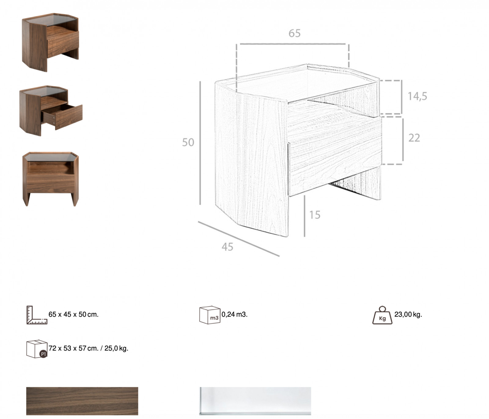 A HENARES éjjeliszekrényről első pillantásra szembetűnik a letisztult eleganciája és minőségi kialakítása. A csodálatos diófával furnérozott szekrényt különlegessé teszi hexagonális kialakítása.  A szekrény tetején edzett üveglap kapott helyet, soft closing mechanizmusú fiókja pedig praktikus tárolást tesz lehetővé.