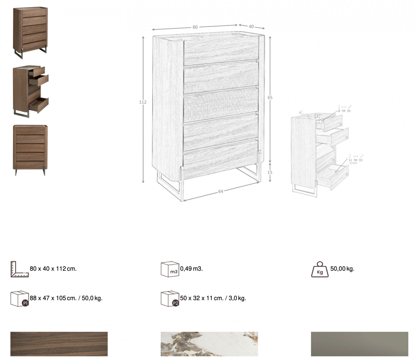 Az IDOLE fiókos szekrény exkluzív és elegáns. A márvány hatású kerámia lappal fedett bútort gyönyörű mintázatú diófával borították. A középső fiókon megjelenő geometrikus mintázat egy kis játékosságot visz a szekrény megjelenésébe. A finom ívekkel rendelkező korpuszt letisztult rozsdamentes acél lábak támasztják alá. A soft closing vasalatokkal szerelt bútor öt fiókja praktikus tárolást biztosít. Kínálatunkban megtalálja az IDOLE termékcsalád többi tagját is. A bútoron azonnal szembetűnik a minőségi anyaghasználat és gondos kivitelezés.