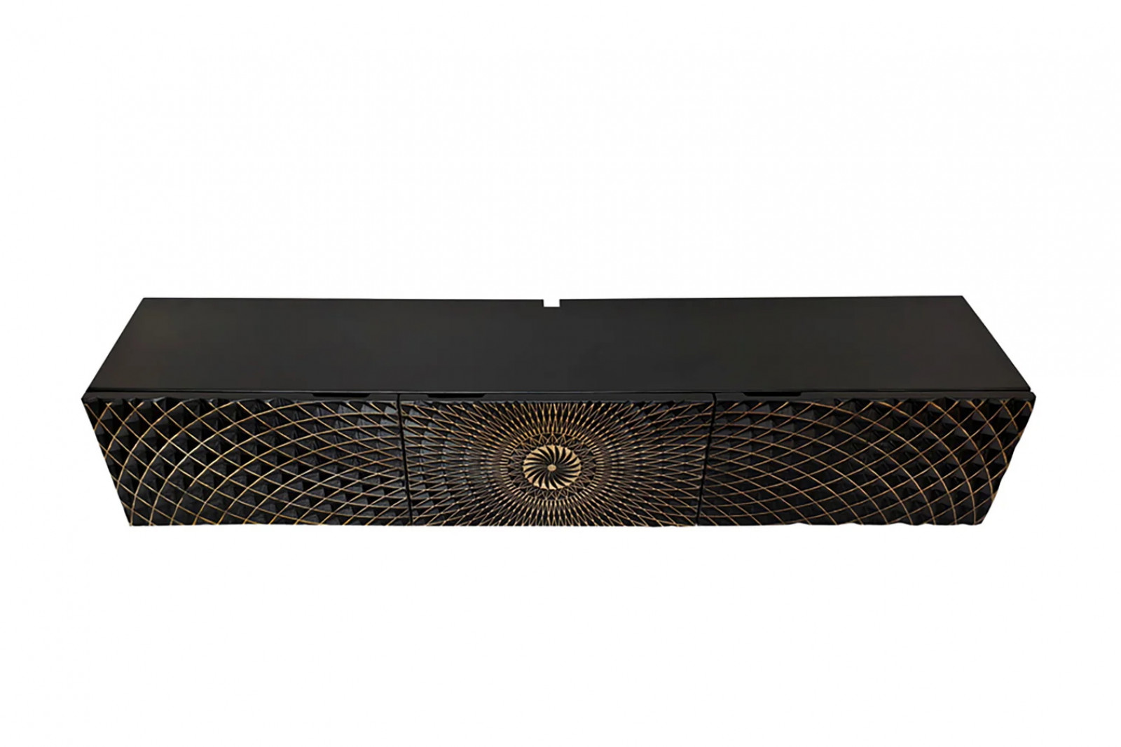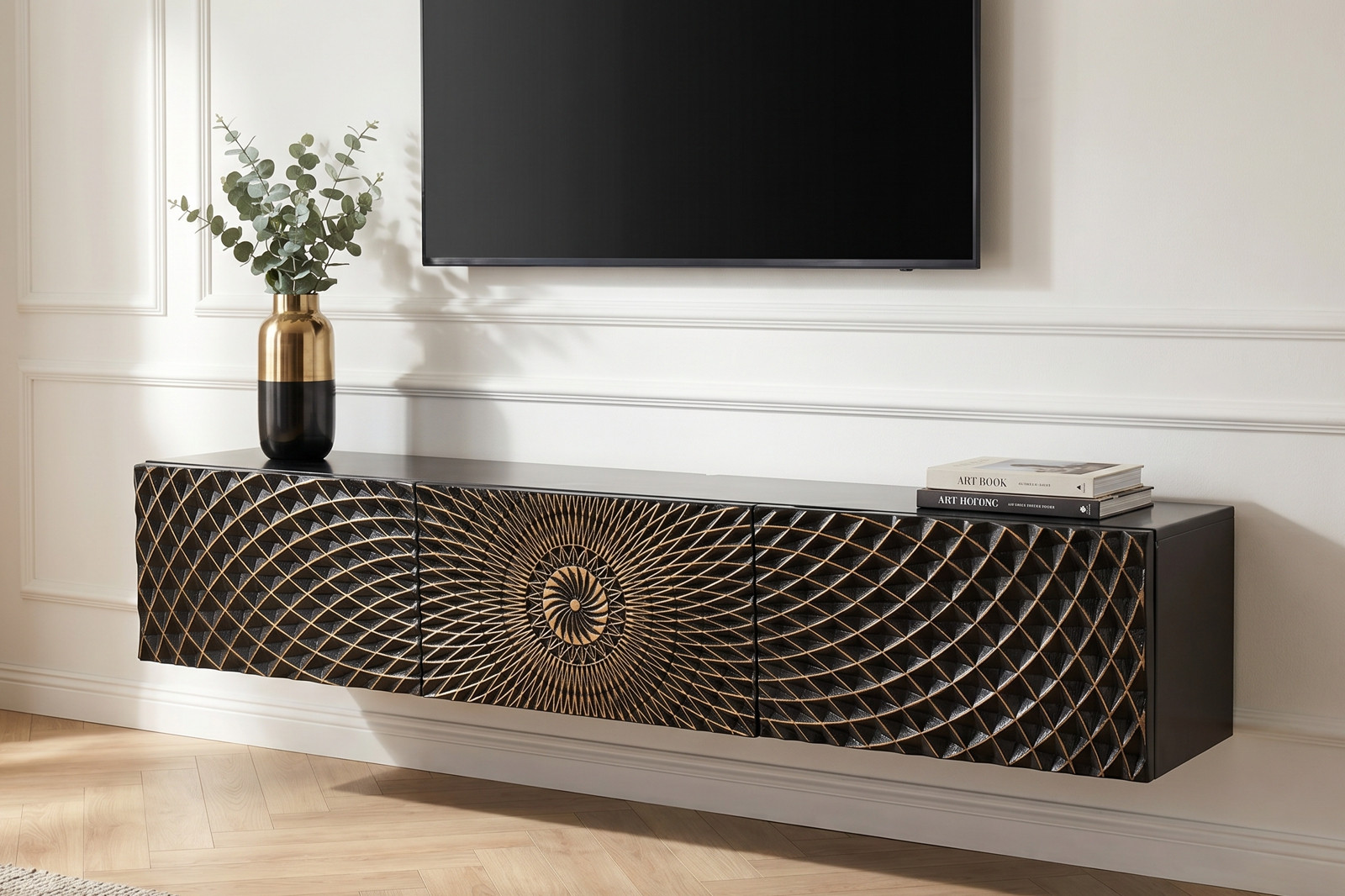 Az ILLUSION függesztett TV-szekrény modern, mégis karakteres megjelenésével elegáns fókuszpontja lehet a nappalinak. A fekete mangófa letisztult alapot ad, amelyet finoman kiemelnek az arany tónusú részletek, így a bútor egyszerre visszafogott és látványos.