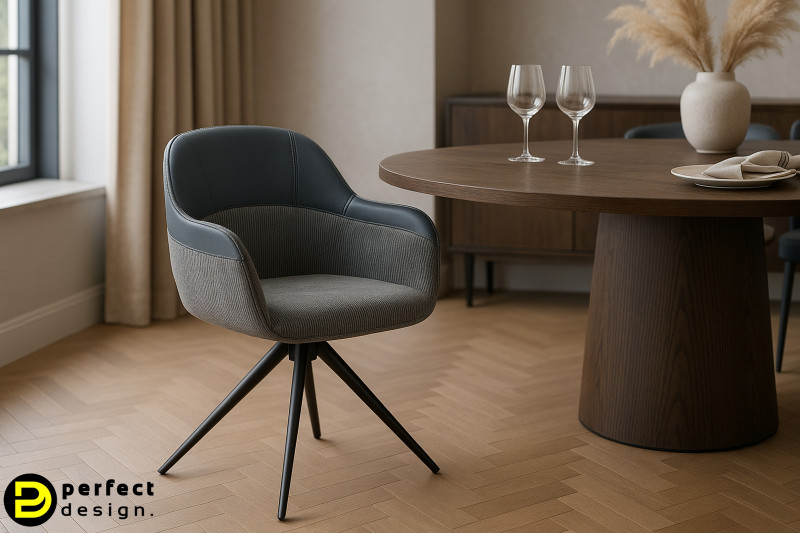 Az ISOTTA szék elegáns és modern választás, amely stílust és kényelmet egyesít. A háttámla felső része finom szintetikus bőr borítást kapott, míg az ülőfelület és az alsó rész texturált szövettel kárpitozott, így kifinomult kontrasztot alkot. A karcsú, fekete, négyágú fém talp stabilitást és modern karaktert biztosít, a forgatható ülés pedig extra praktikummal gazdagítja. Ideális darab azok számára, akik időtlen eleganciát keresnek a mindennapokban.
