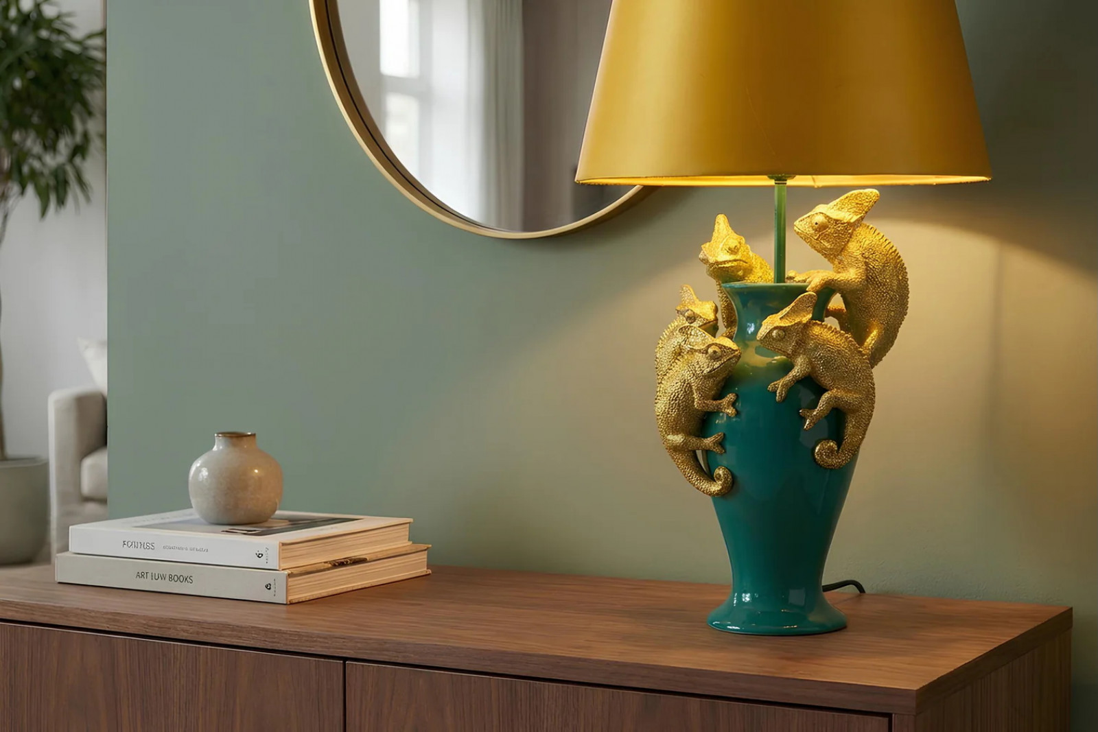 A KAMELEON asztali lámpa igazán különleges látványt nyújt. Az elegáns zöld lámpát játékossá teszik az arany színű kaméleonok és a citromsárga színű lámpaernyő. Extravagáns dísze lehet bármely helyiségnek.