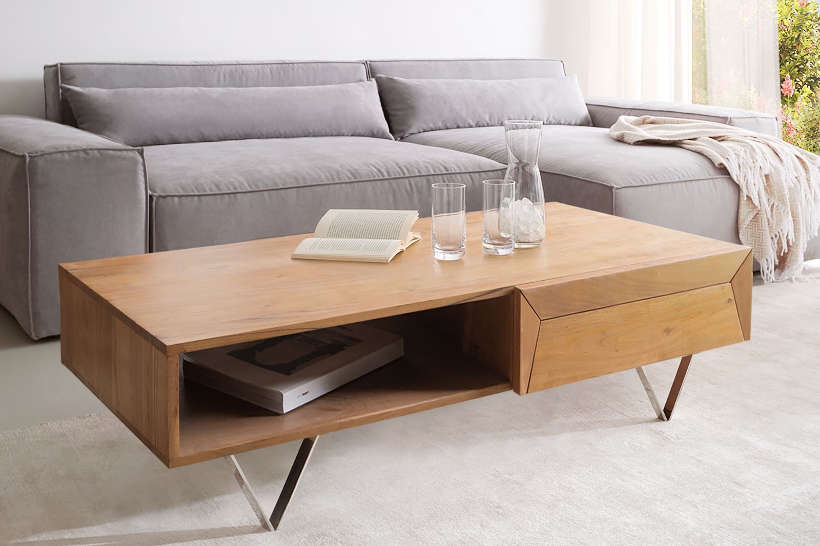 A KENNEDY dohányzóasztal káprázatos bútordarab. A csodás mintázatú akácfából készült asztal fiókjait geometrikus bemarások teszik három dimenziós hatásúvá.