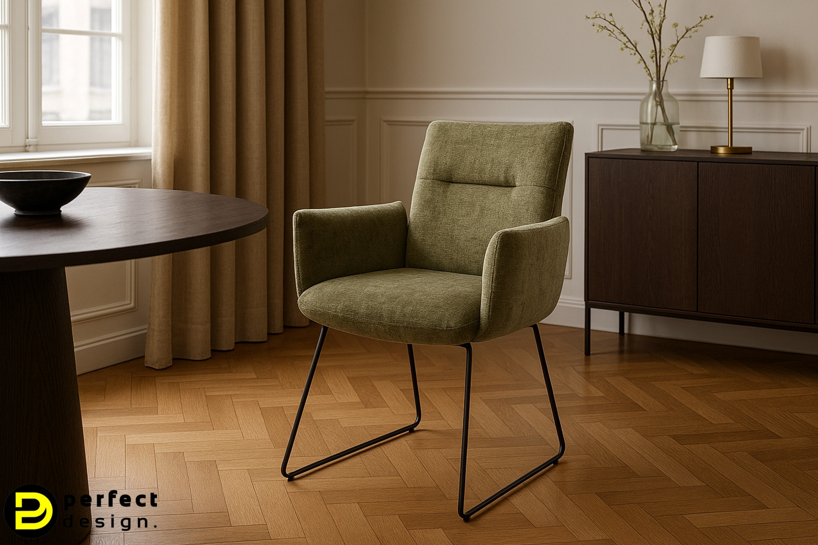 A KILEN étkezőszék a modern elegancia és a kifinomult kényelem találkozása. A finom szövésű zsenília kárpit nemcsak elegáns, hanem különösen puha tapintású és strapabíró is, így hosszú távon megőrzi szépségét. Az ívelt háttámla és a karfák kényelmes tartást biztosítanak, miközben a letisztult formavilág harmonikusan illeszkedik a kortárs enteriőrökbe.