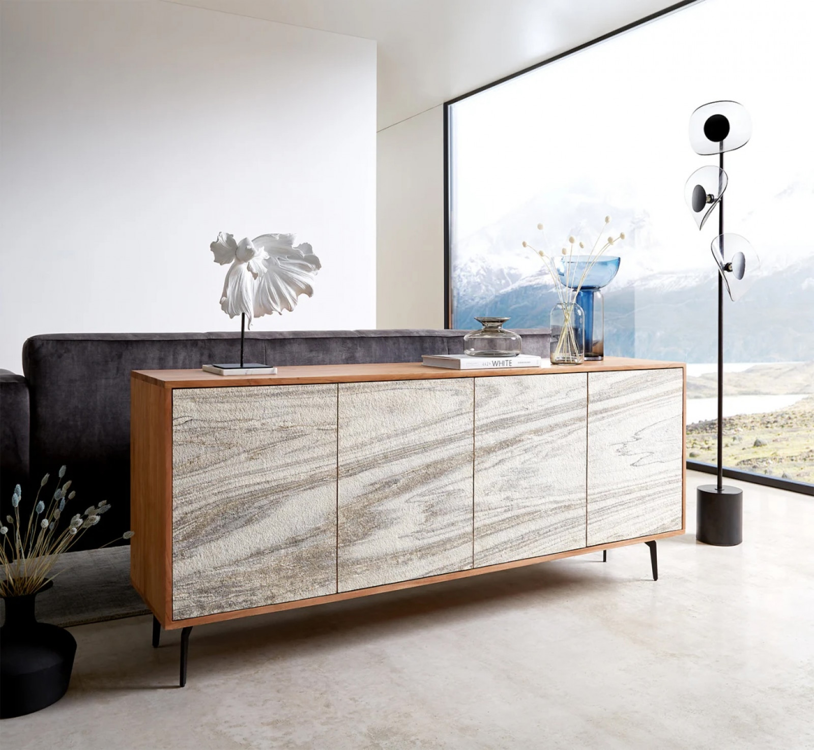 A KLEO komód káprázatos bútordarab. Az akácfából készült komód négy ajtaját csodáslatos textúrájú és színvilágú kőfurnérral borították. A kőben áramló színek karizmatikus kontrasztot alkotnak az akác mézbarna árnyalatával. Letisztult vonalvezetésű fekete fém lábai harmonikus kiegészítői a korpusznak.