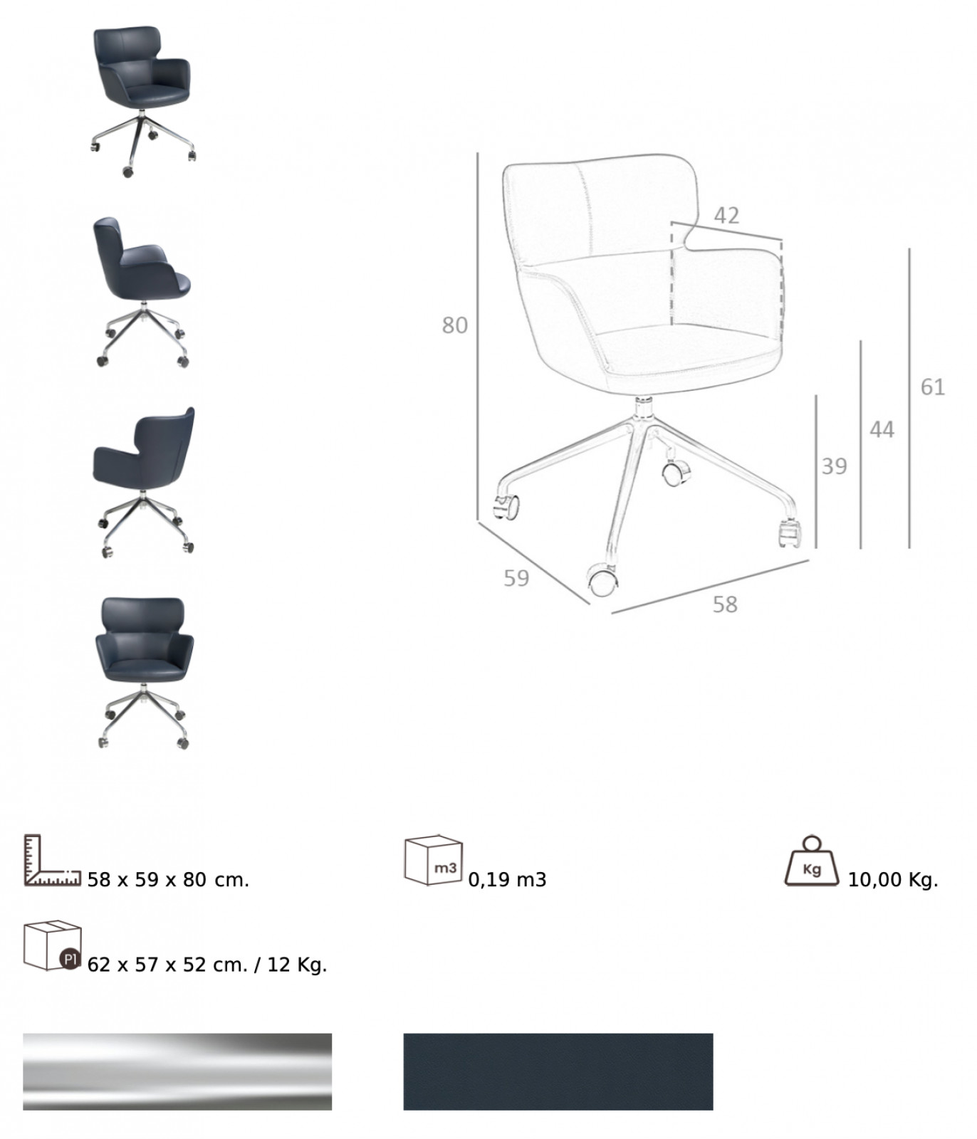 A LANDETE forgószék a kortárs design kiemelkedő darabja. A fiatalos vonalvezetésű szék magas minőségű anyagok felhasználásával készült. A sötétkék eco bőrrel borított szék kényelmes ülőfelületét csillogó, krómozott rozsdamentes acél láb támasztja alá. Mutatós darabja lehet modern irodáknak és tárgyalóknak egyaránt.