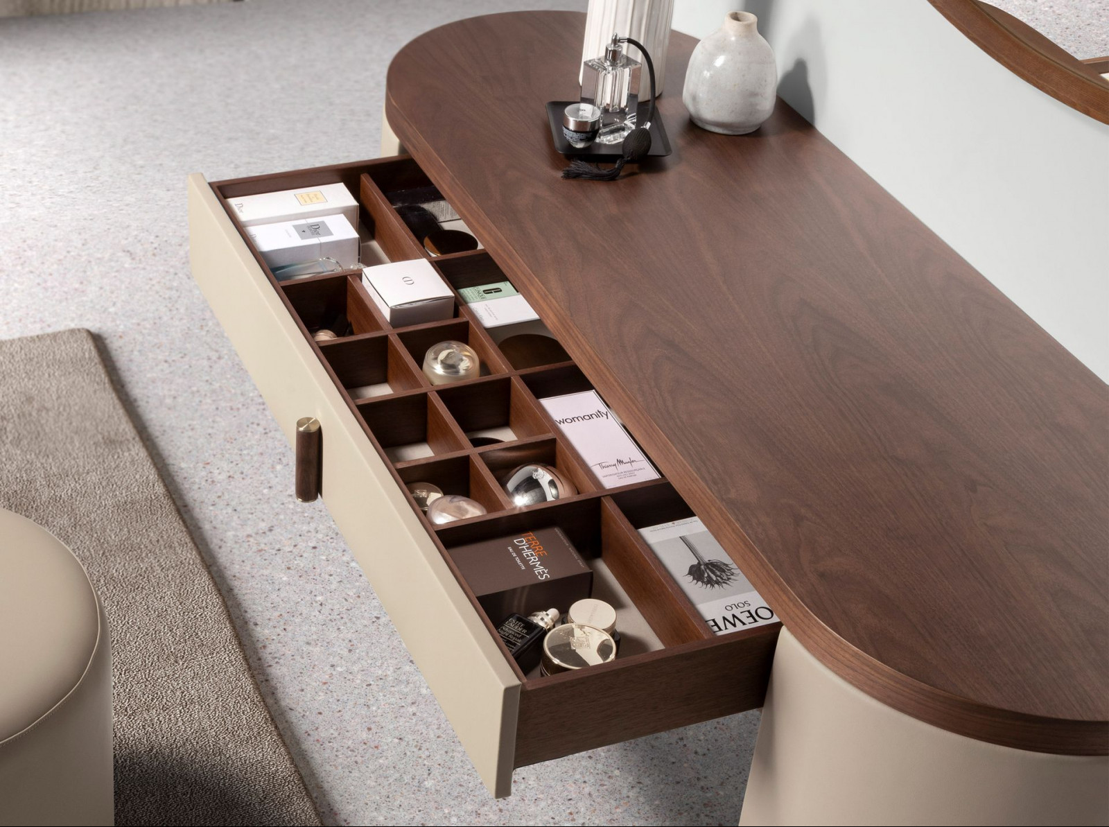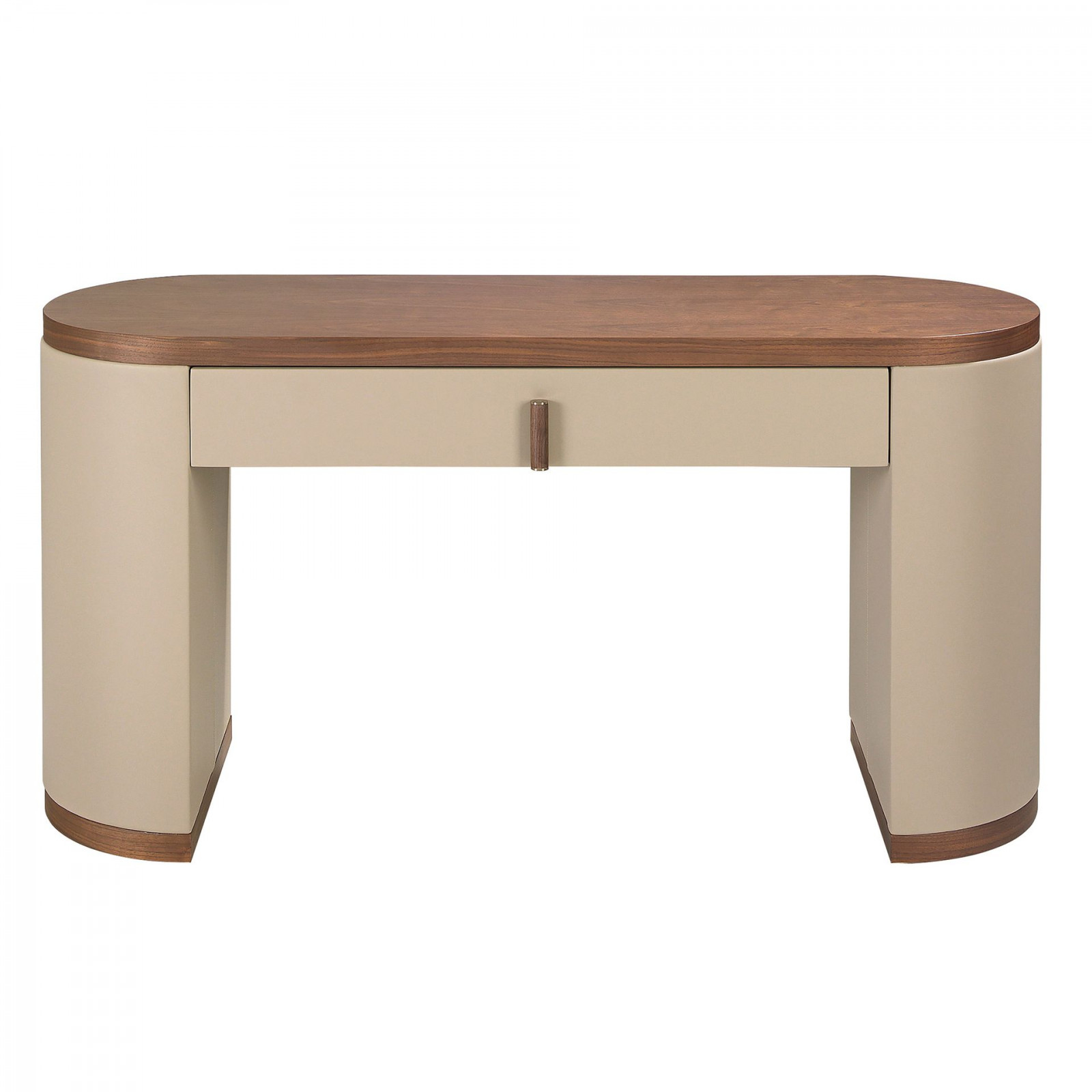 A LAVIDA konzolasztal a spanyol formatervezés és a funkcionális elegancia tökéletes egyensúlyát hozza el a hálószobába vagy gardróbba. A beige színű szintetikus kárpitozott felülete finoman meleg tónust ad a bútorfrontoknak, miközben a diófa részletek természetes karaktert visznek a térbe.