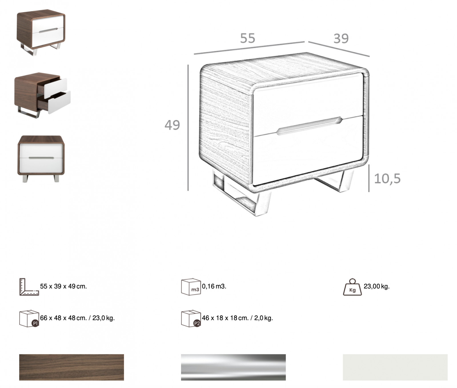 A LEGANES éjjeliszekrény modern és letisztult darab. Az éjjeliszekrény korpusza diófával furnérozott, soft closing záródású fiókjainak előlapja magasfényű fehér színű. A bútort csillogóan fényes króm talpak támasztják alá, illetve a két fiók találkozásához is króm betétet helyeztek tervezői, mely tovább növeli exkluzivitását.