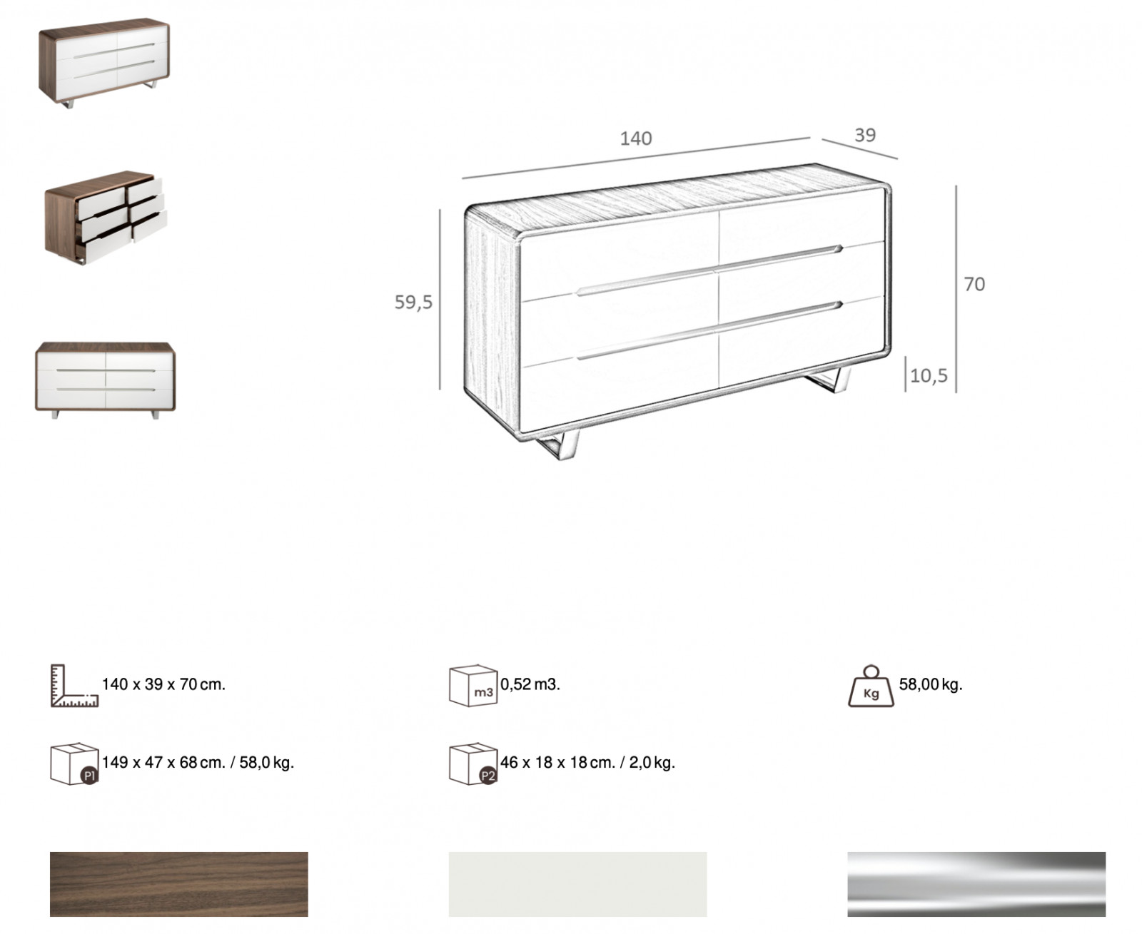 A LEGANES fiókos komód modern és letisztult darab. A szekrény korpusza diófával furnérozott, soft closing záródású fiókjainak előlapja magasfényű fehér színű. A bútort csillogóan fényes króm talpak támasztják alá, illetve a fiókok találkozásához is króm betétet helyeztek tervezői, mely tovább növeli exkluzivitását.
