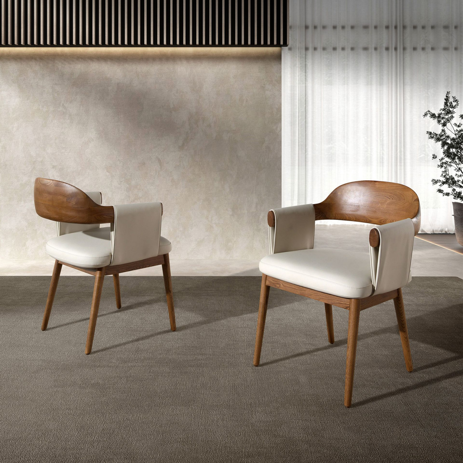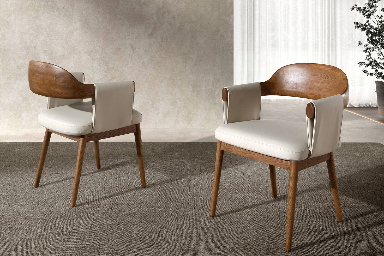 A LIDORIA szék az időtlen elegancia és a modern dizájn kifinomult találkozása. A dió színű lágyan ívelt háttámla és lábszerkezet kifinomult kontrasztként áll a krémszínű szintetikus bőr ülőfelület mellett. Az ergonomikusan kialakított karfák és a párnázott ülés maximális kényelmet nyújtanak, miközben a természetes anyagok és a precíz vonalvezetés a tér karakterét emelik.