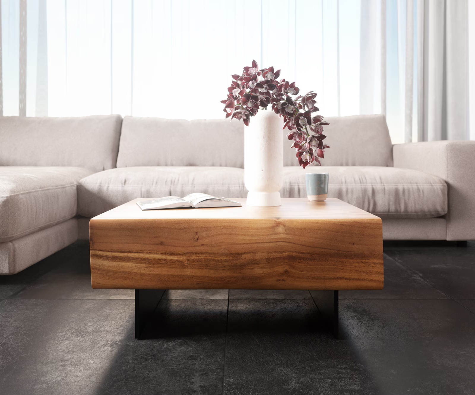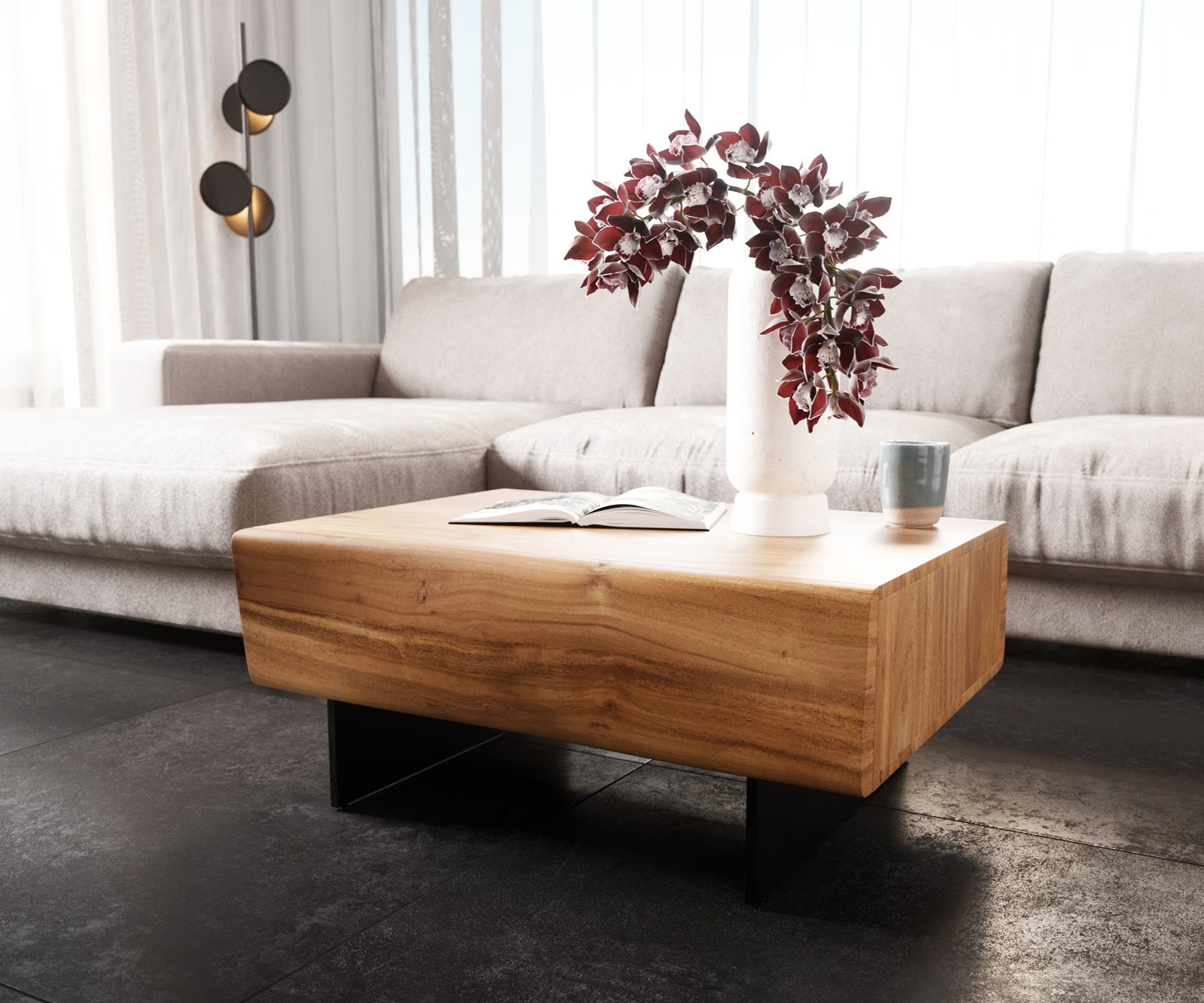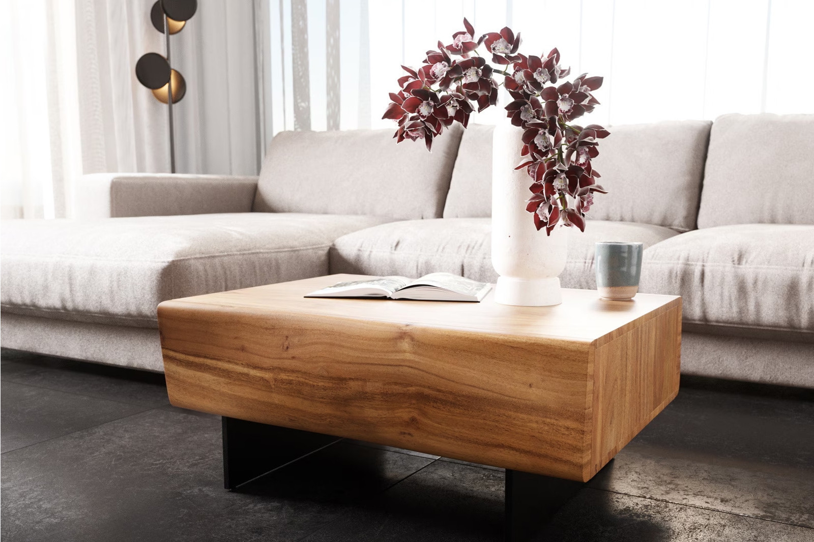 A LOVECRAFT dohányzóasztal káprázatos bútordarab. A nemes, tömör akácfából készült asztal egyszerű, kifinomult vonalvezetése magával ragadja a tekintetet. A hullámzó, három dimenziós fronttal rendelkező fiókok és a légies fekete fém lábak teszik igazán lenyűgözővé a bútort.