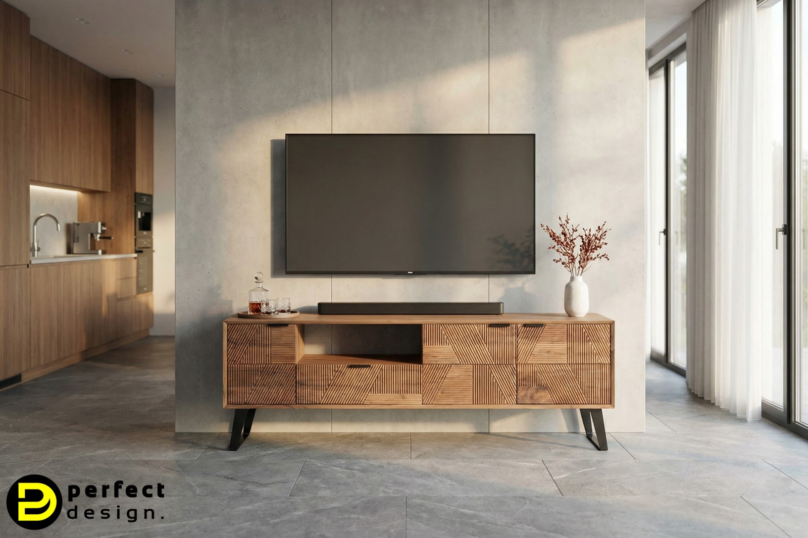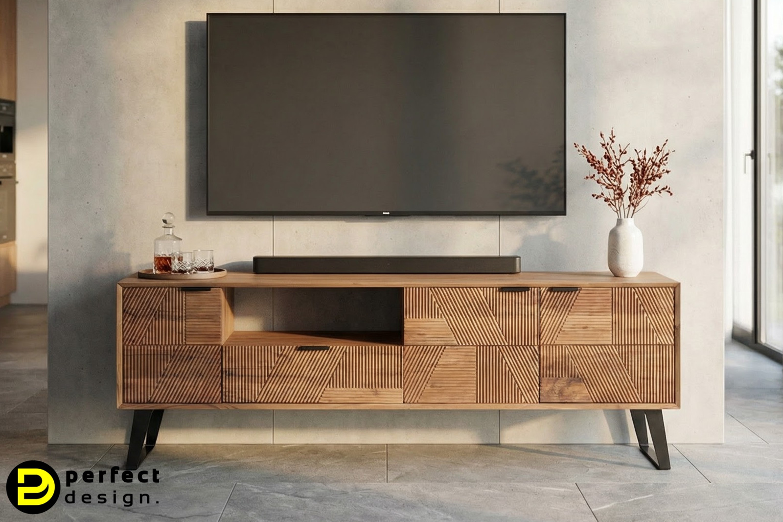 A LUCCA TV-szekrény modern és divatos. A gyönyörű mintázatú akácfából készült szekrényt letisztult fekete fém lábak támasztják alá és a geometrikus bemarásokkal díszített front három dimenziós látványt nyújt. Ha egy igazán különleges és egyedi bútordarabot szeretne, remek választás ez a TV-szekrény.
