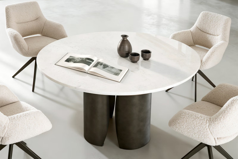 A LUCENTE étkezőasztal a modern elegancia egyik legszebb példája. A márvány asztallap finom erezetével és természetes fényjátékával azonnal luxusérzetet teremt. A kecsesen metszett fém lábak könnyed geometriája modern karaktert visz a bútorba, miközben stabil alapot ad. A kő és a fém kontrasztja időtlenül hat elegánsnak, a letisztult arányok pedig bármilyen enteriőrben kiemelik az asztal kifinomult jelenlétét.