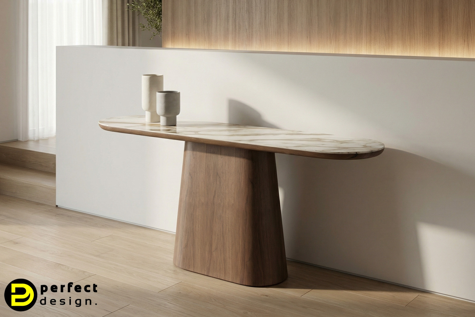 A diófa furnérral borított, félkörívben hajlított láb szoborszerűen emeli ki az asztal karakterét. A forma egyszerre modern és időtlen – a lágy ívek és a természetes anyagok kombinációja melegséget, stabilitást és eleganciát sugároz.