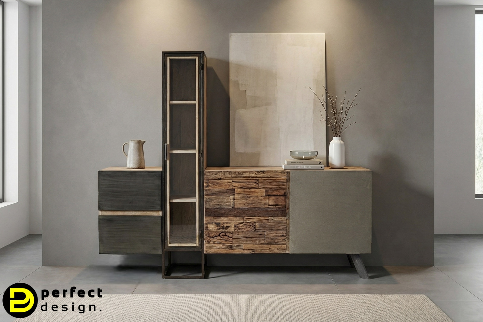 A MANCHESTER komód különlegesen egyedi, extravagáns bútordarab. A látványos kialakítású bútor korpuszát mangófából készítették, az ajtókat négy különböző anyagból formálták: fém, üveg, újrahasznosított teakfa és beton követik egymást. A bútor kézzel készült, minden darab teljesen egyedi, megjelennek rajta ezáltal rusztikus és indusztriális jegyek is.