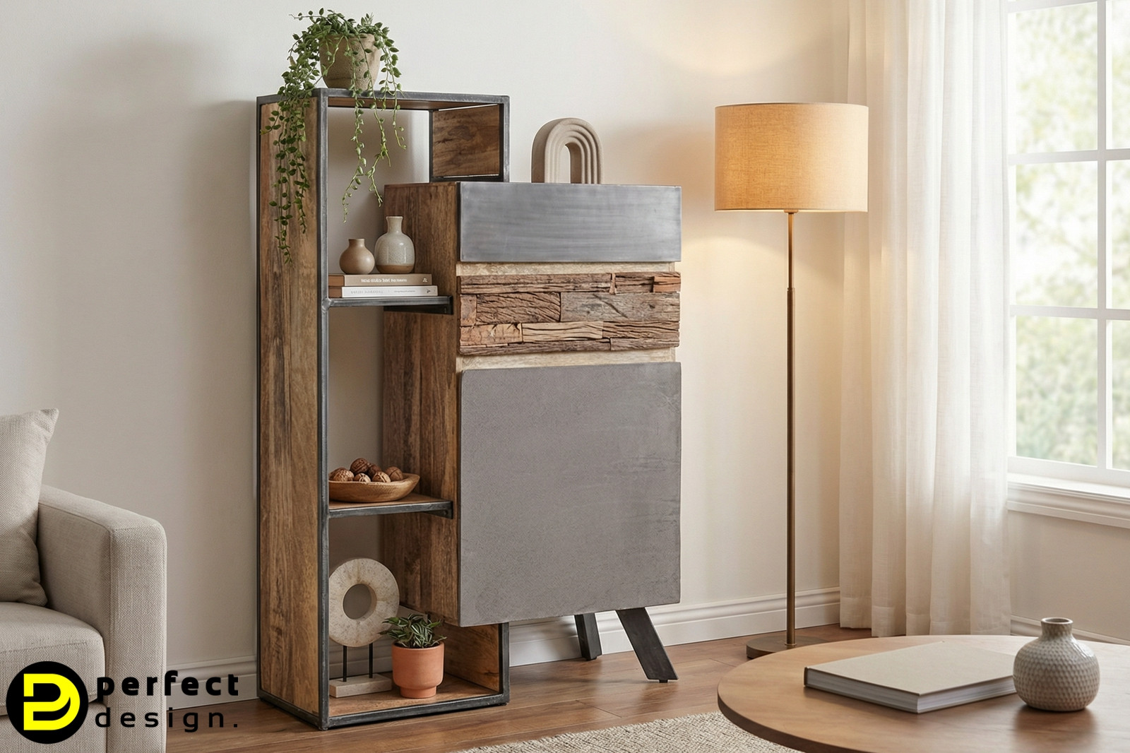 A MANCHESTER szekrény különlegesen egyedi, extravagáns bútordarab. A látványos kialakítású bútor korpuszát mangófából készítették, a frontját három különböző anyagból formálták:  fém , újrahasznosított teakfa és beton követik egymást. A bútor kézzel készült, minden darab teljesen egyedi, megjelennek rajta ezáltal rusztikus és indusztriális jegyek is.