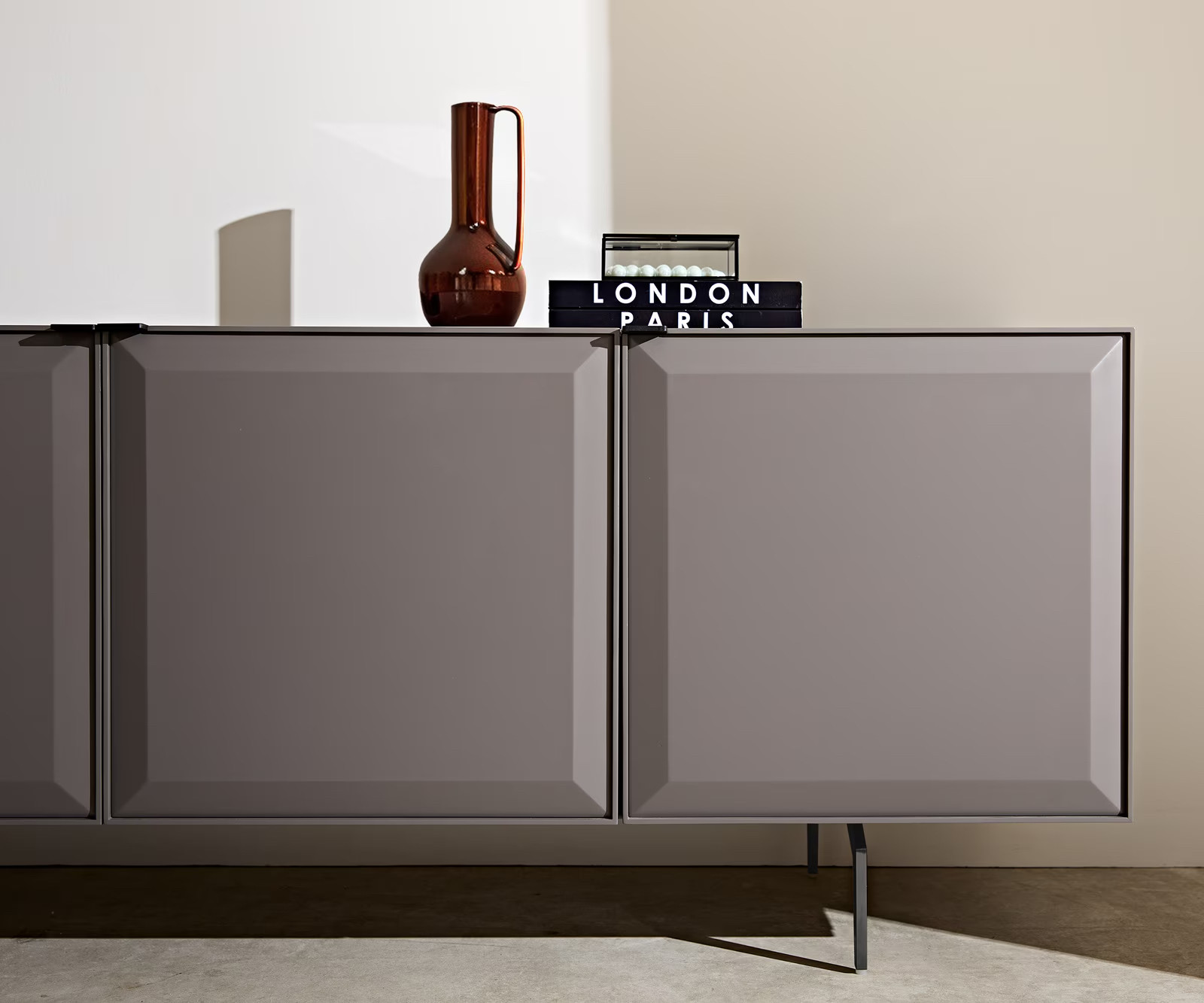 A fekete, szögletes fém lábak légies, lebegő hatást keltenek, miközben stabil alapot nyújtanak. A 220 cm-es szélesség bőséges tárolóhelyet kínál, így a MARELLIA TV-szekrény nemcsak esztétikai, hanem funkcionális szempontból is kiváló választás.