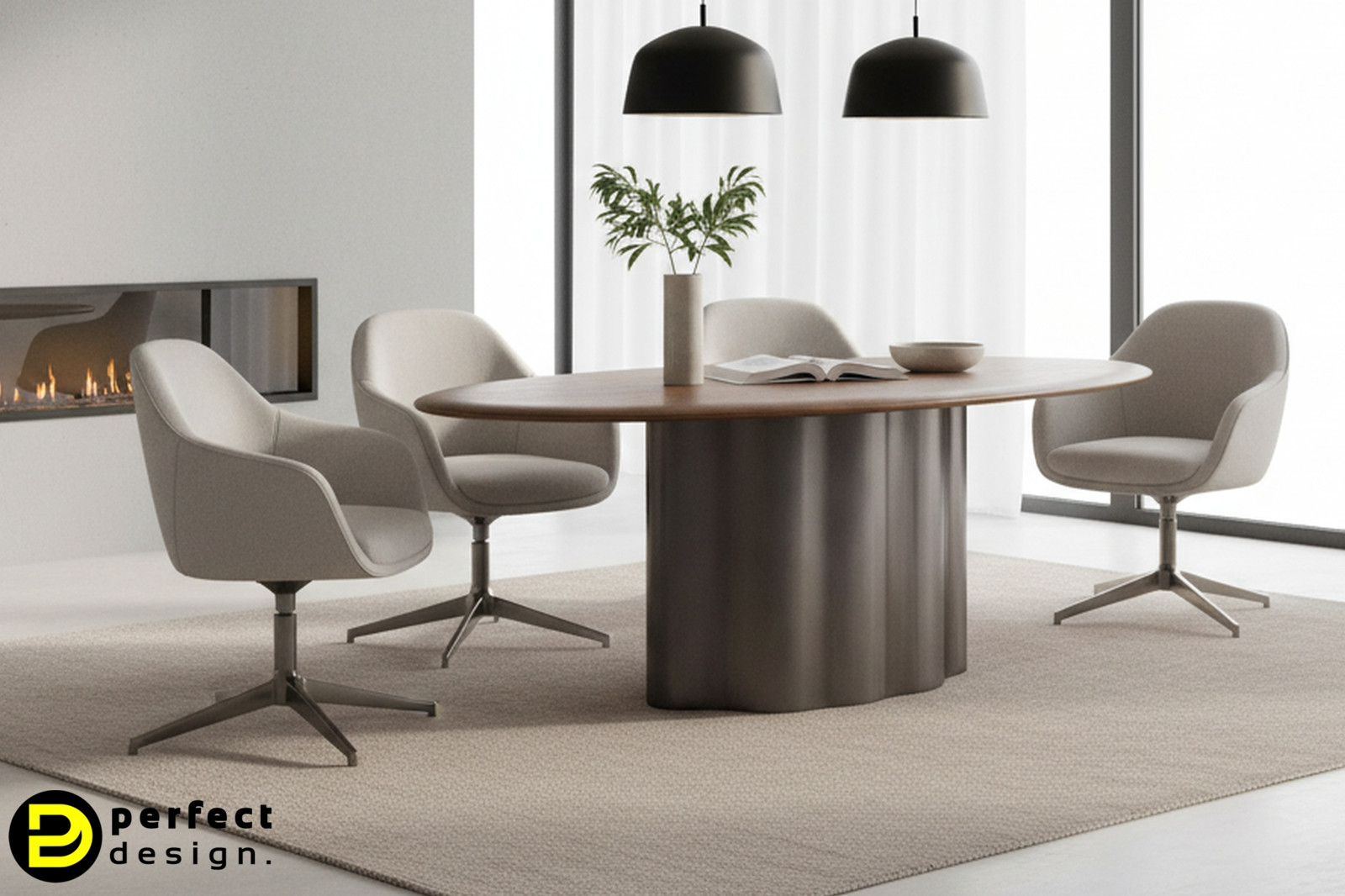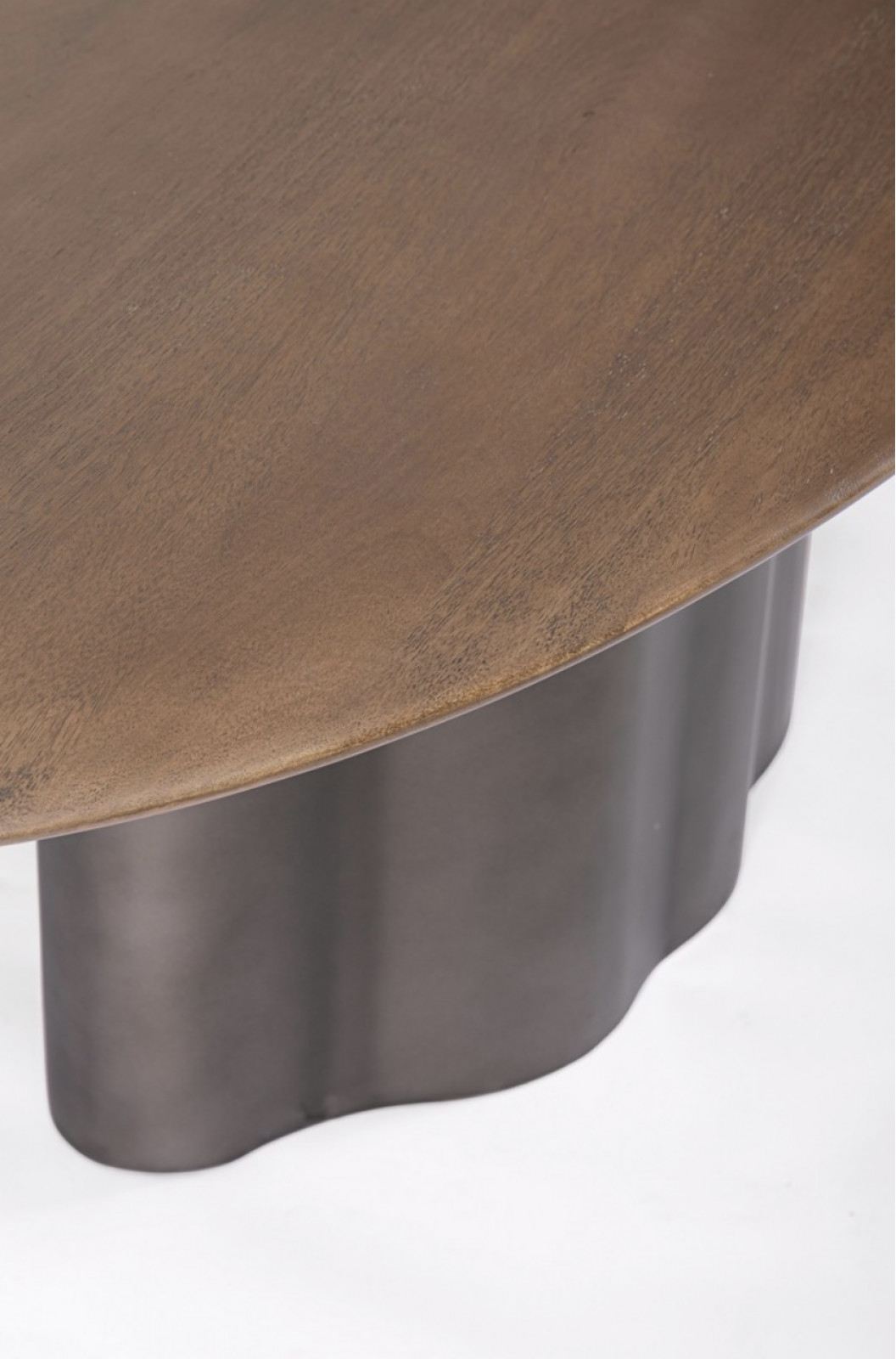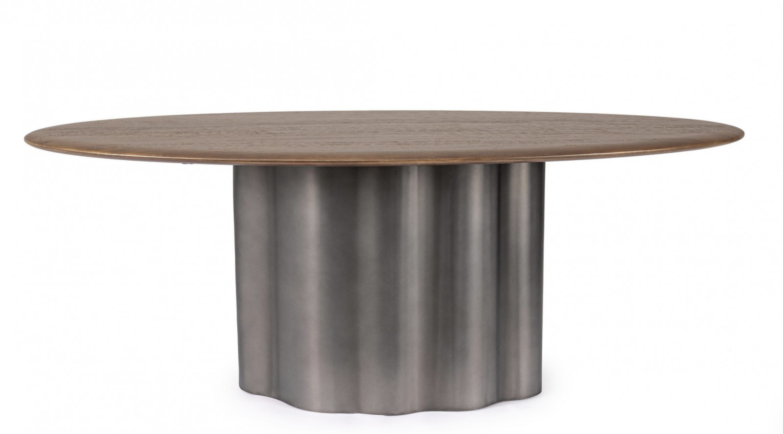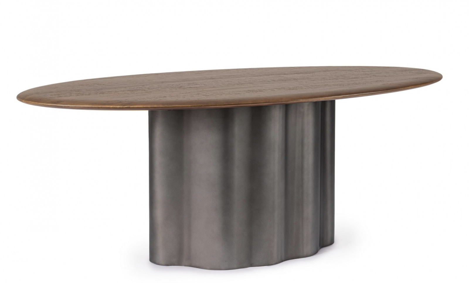 A stabil fém láb modern kontrasztot teremt a fa természetességével, az ovális forma pedig barátságos, harmonikus összhatást biztosít. Ideális választás tágas étkezőkbe, ahol a design és a funkcionalitás egyaránt fontos.