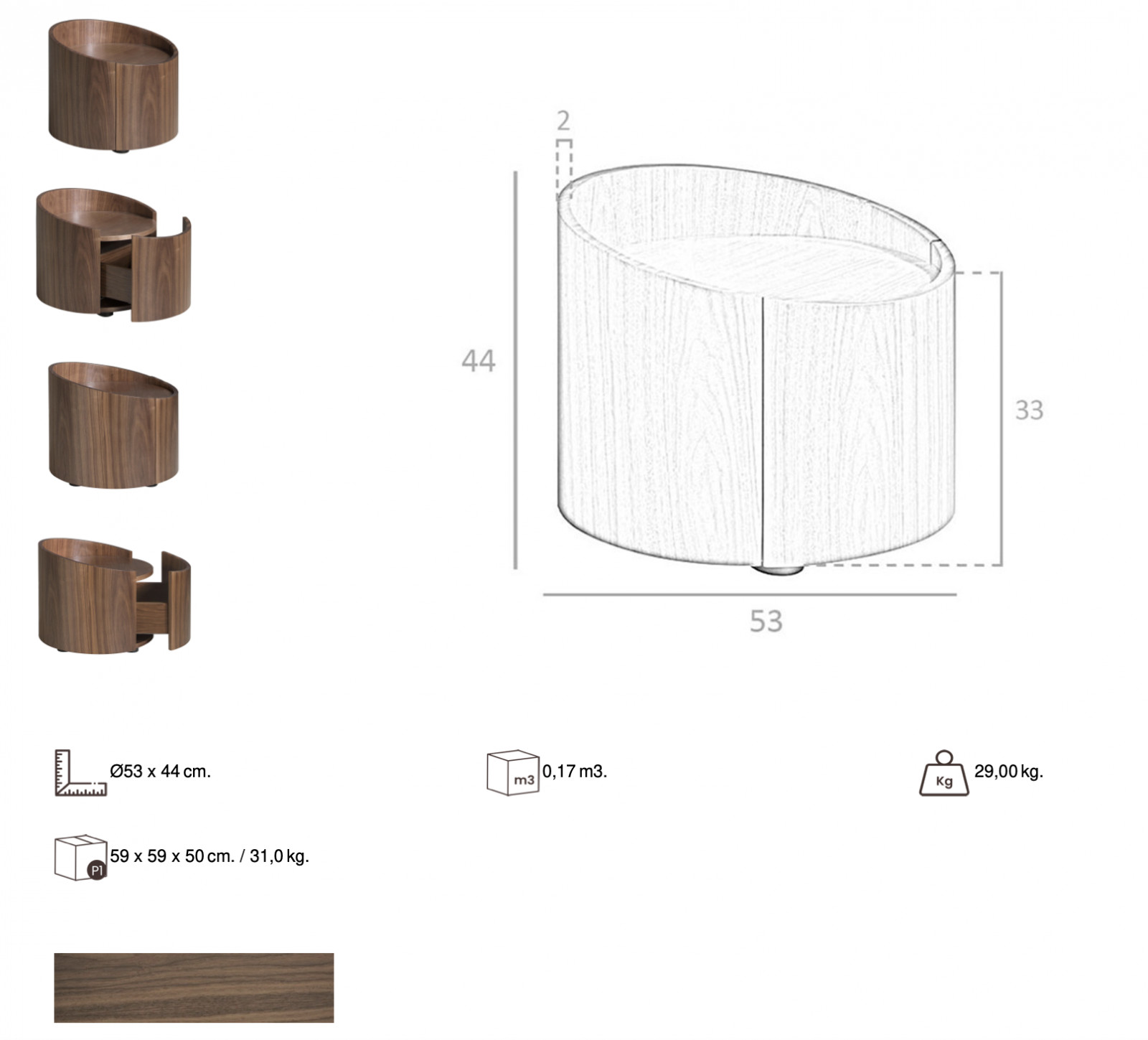A MARTÍN éjjeliszekrény modern és stílusos. A gyönyörű diófával furnérozott szekrény hajlított vonalai exkluzivitást sugároznak. A tervezők egy fiókot is elrejtettek a szekrényben, mely praktikussá teszi használatát. Csodás kiegészítője lehet egy modern hálószobának vagy nappalinak ez a kifinomult bútordarab.