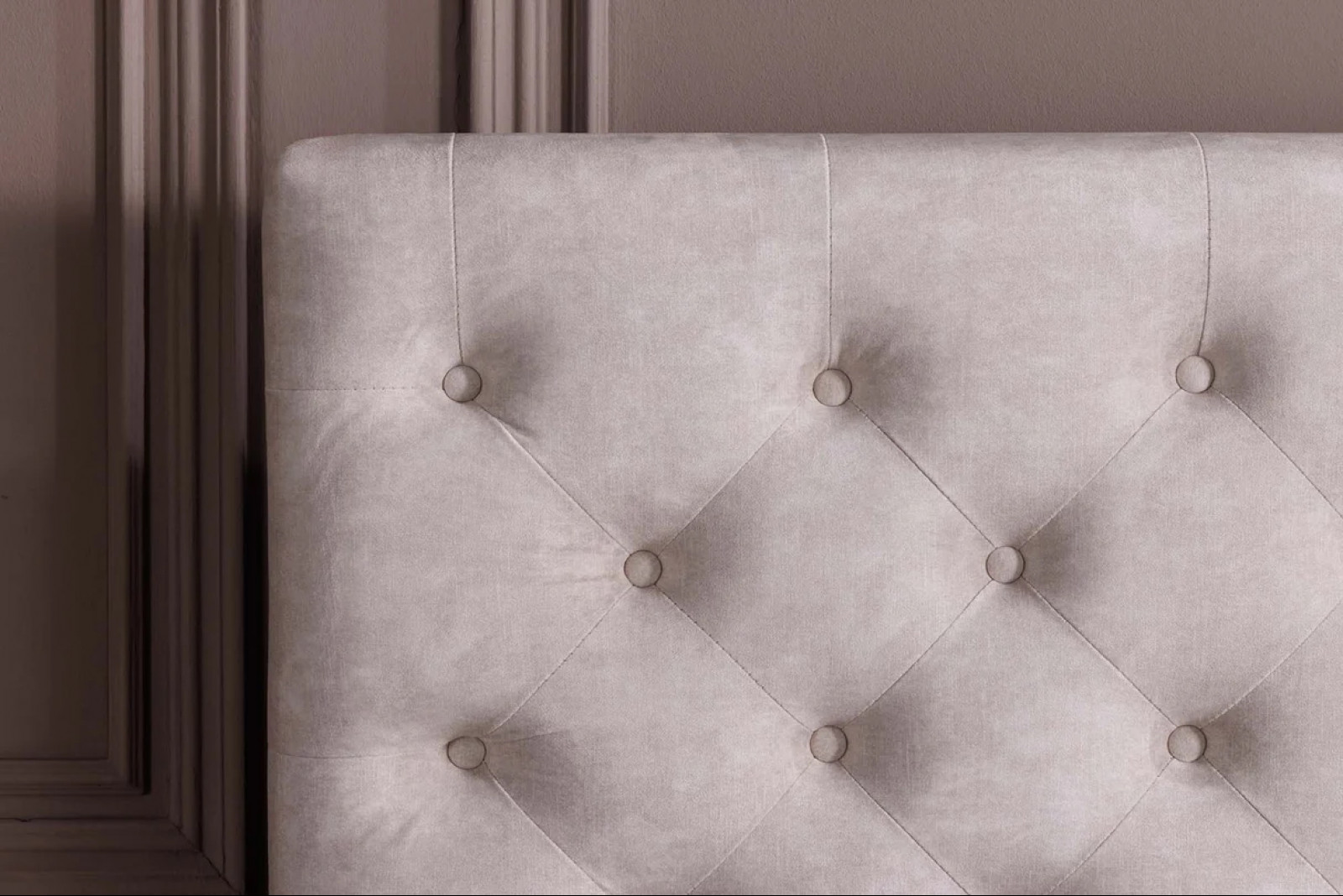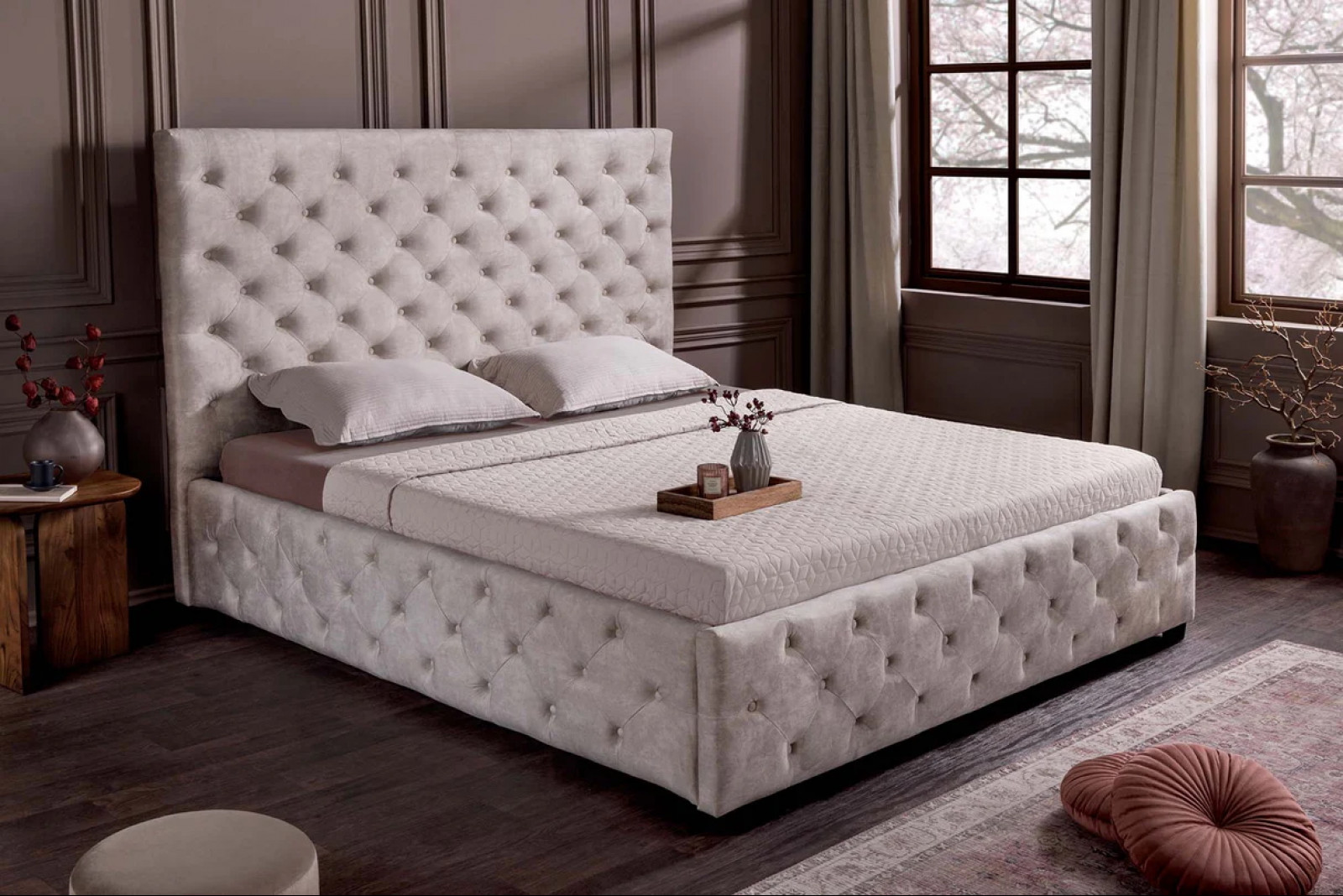A MERCURE boxspring ágy egy modern, mégis időtlen hálószoba-klasszikus, amely a selymes bársonyra és Chesterfield-inspirált díszsteppelésre építve kecses eleganciát visz a hálószobába. A puha, pezsgő színű kárpit finoman világosítja és harmonizálja a teret, miközben a steppelés karaktert és mélységet ad a fejtámlának.