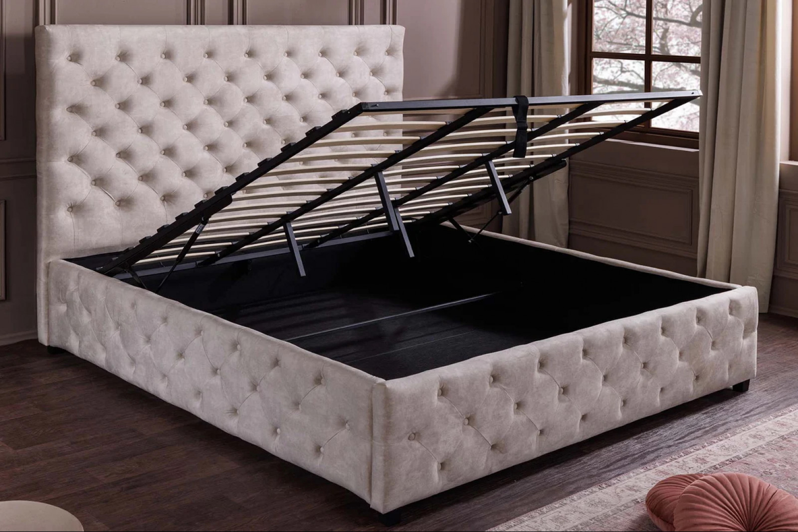 Több mint egy ágy: a beépített, könnyen nyitható tárolórekesz révén praktikus helyet kínál takaróknak, párnáknak vagy szezonális textíliáknak, így a hálószoba rendezett és letisztult marad.
