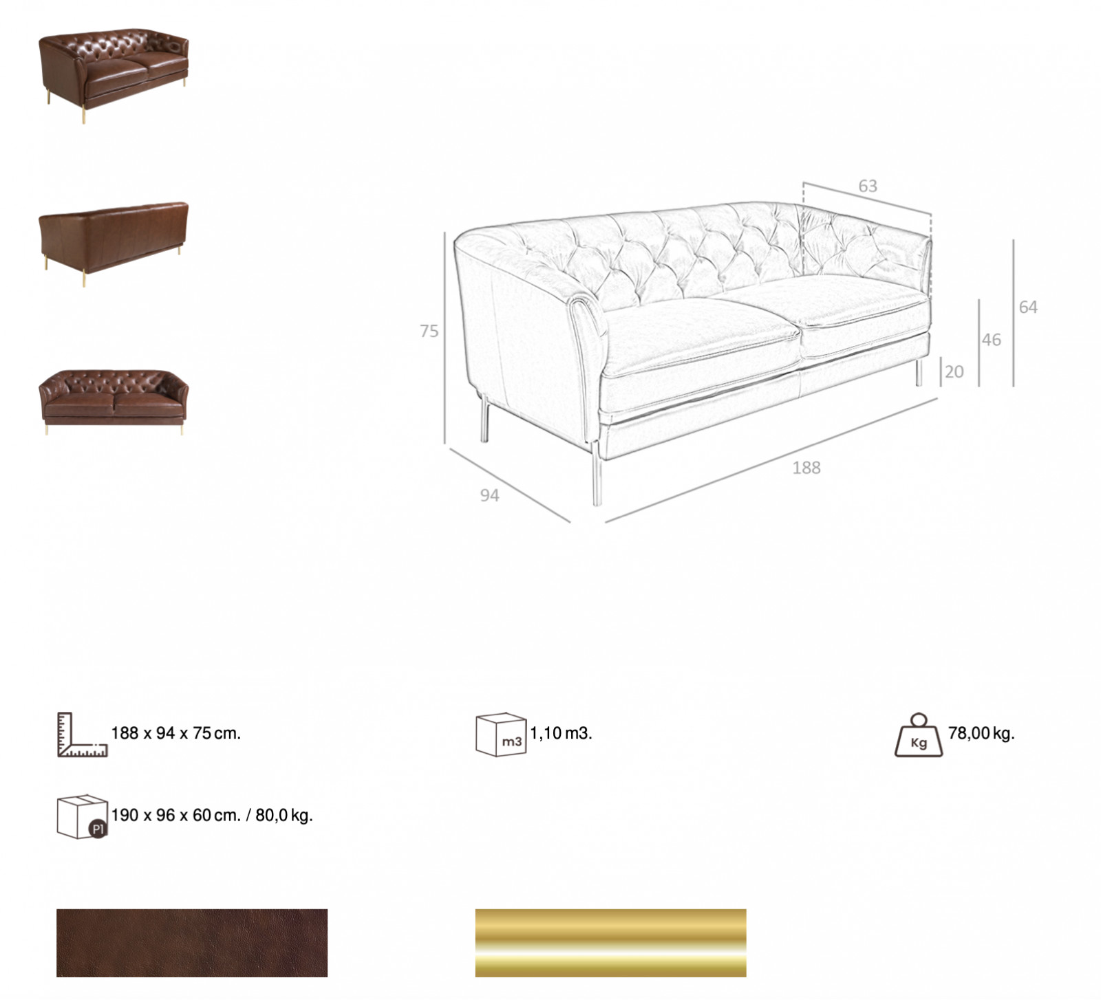 A MEREDIN kanapé exkluzív és időtálló designnal rendelkezik. A minőségi marhabőrrel borított kanapét klasszikus vonalvezetés jellemzi, melyet divatossá tesznek a csillogó arany lábak.Különlegességét a capitonné technikával steppelt háttámlája adja, mely nagy szakértelmet igényel. Pompás dísze lehet modern és klasszikus otthonoknak egyaránt. A minőségi megmunkálás és anyaghasználat azonnal szembetűnik a bútordarabon, melyet spanyol designerek terveztek.