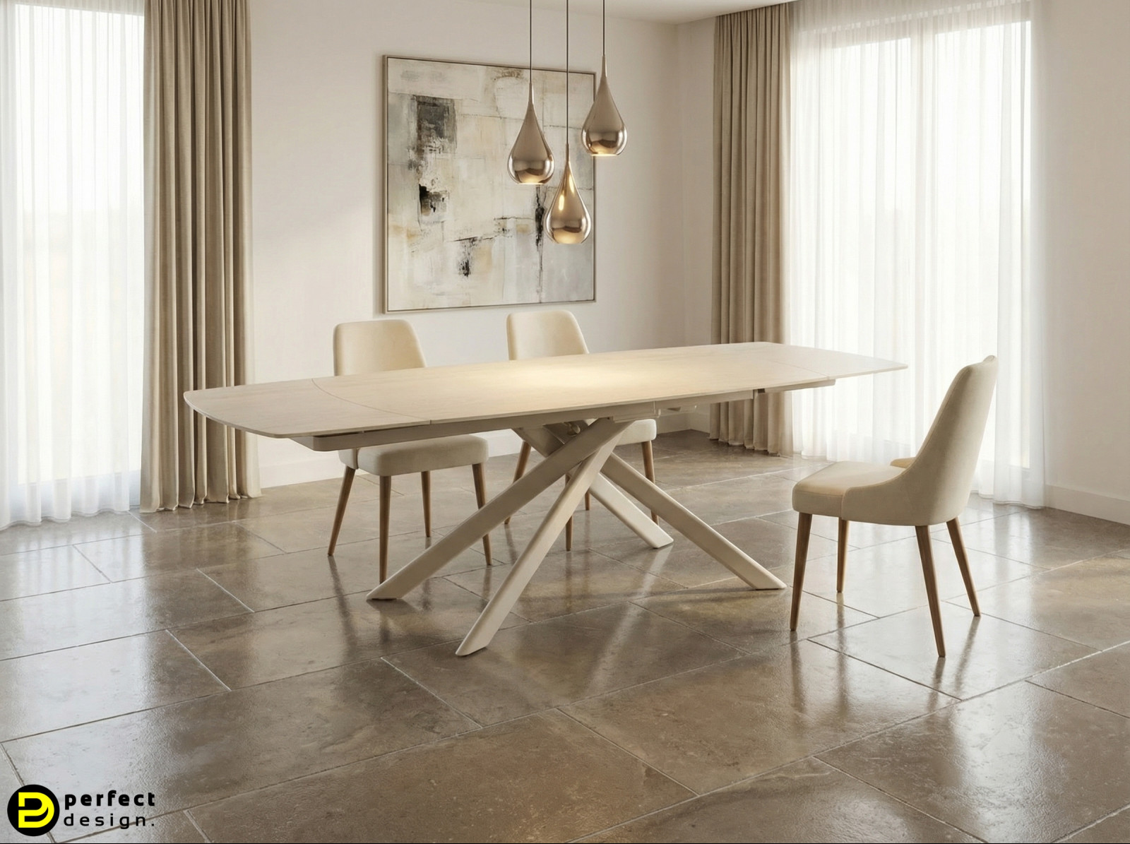 A bútor legkarakteresebb eleme a dinamikus, több irányba széttartó fém lábazat. A beige szerkezet nemcsak stabil tartást biztosít, hanem erőteljes, modern vizuális hatást is kelt, amely egyedivé teszi az asztalt minden enteriőrben.