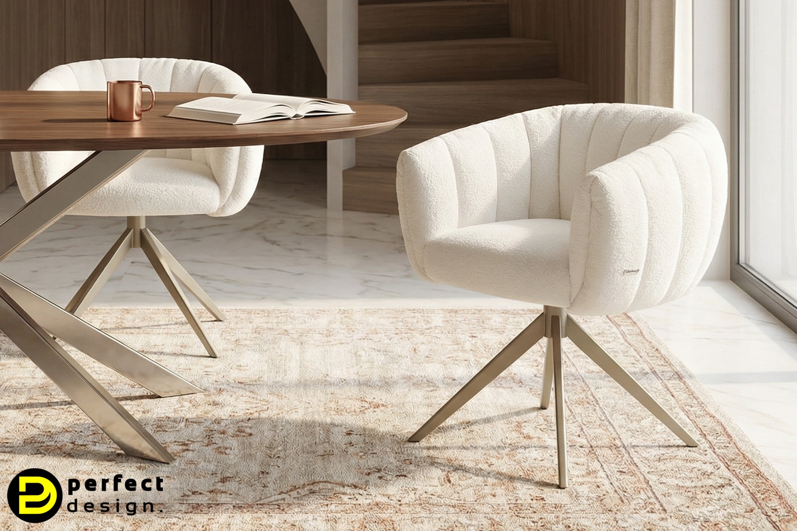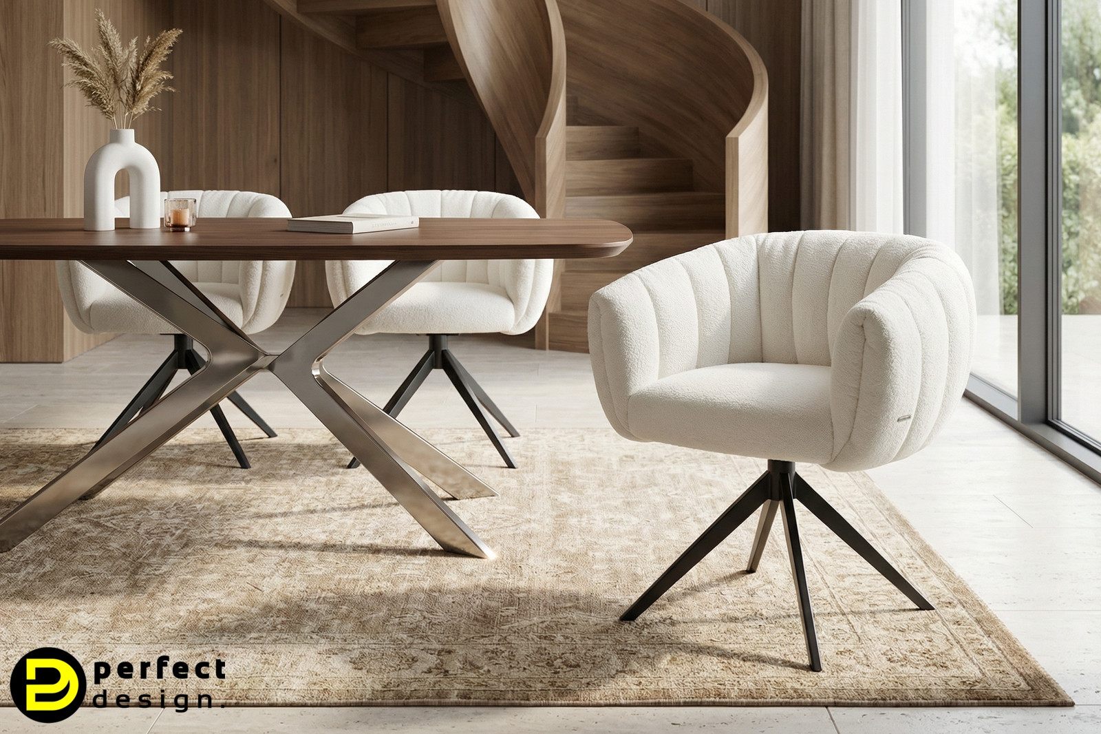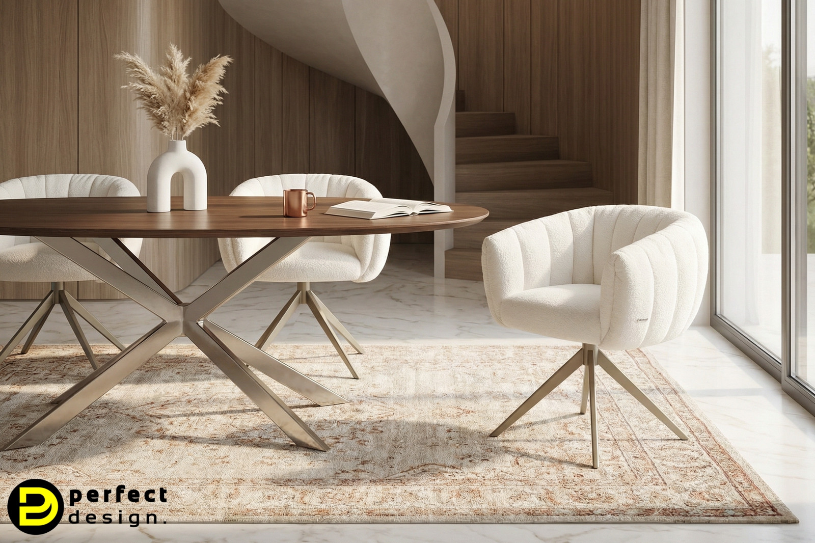 A MOIRA étkezőszék a modern formatervezés és a mindennapi kényelem harmonikus ötvözete. A lágy tapintású bouclé szövet finoman simul az ülés és háttámla felületére, így nemcsak elegáns megjelenést ad, hanem kényelmes, barátságos érzést is biztosít az étkezések során.
