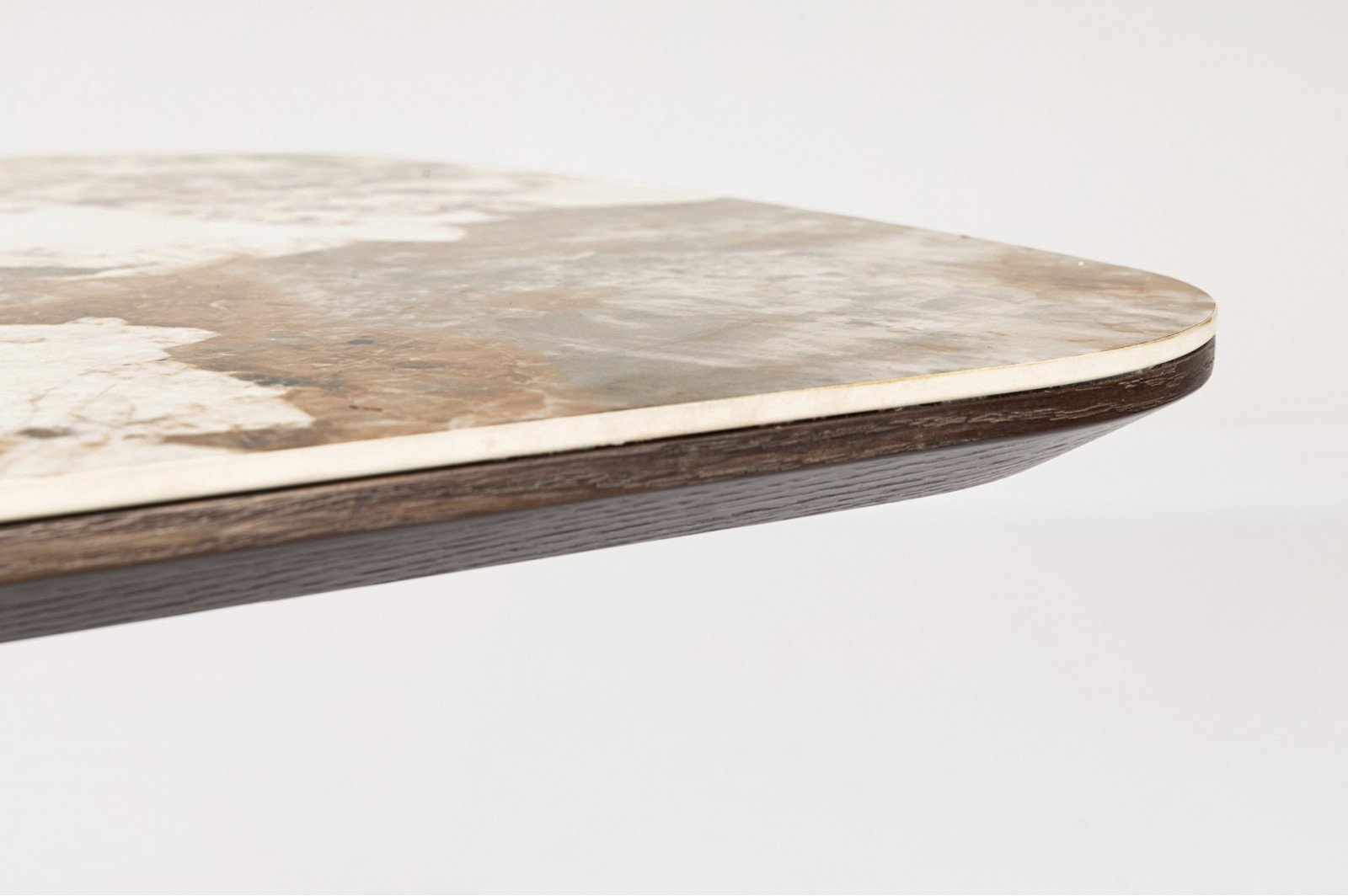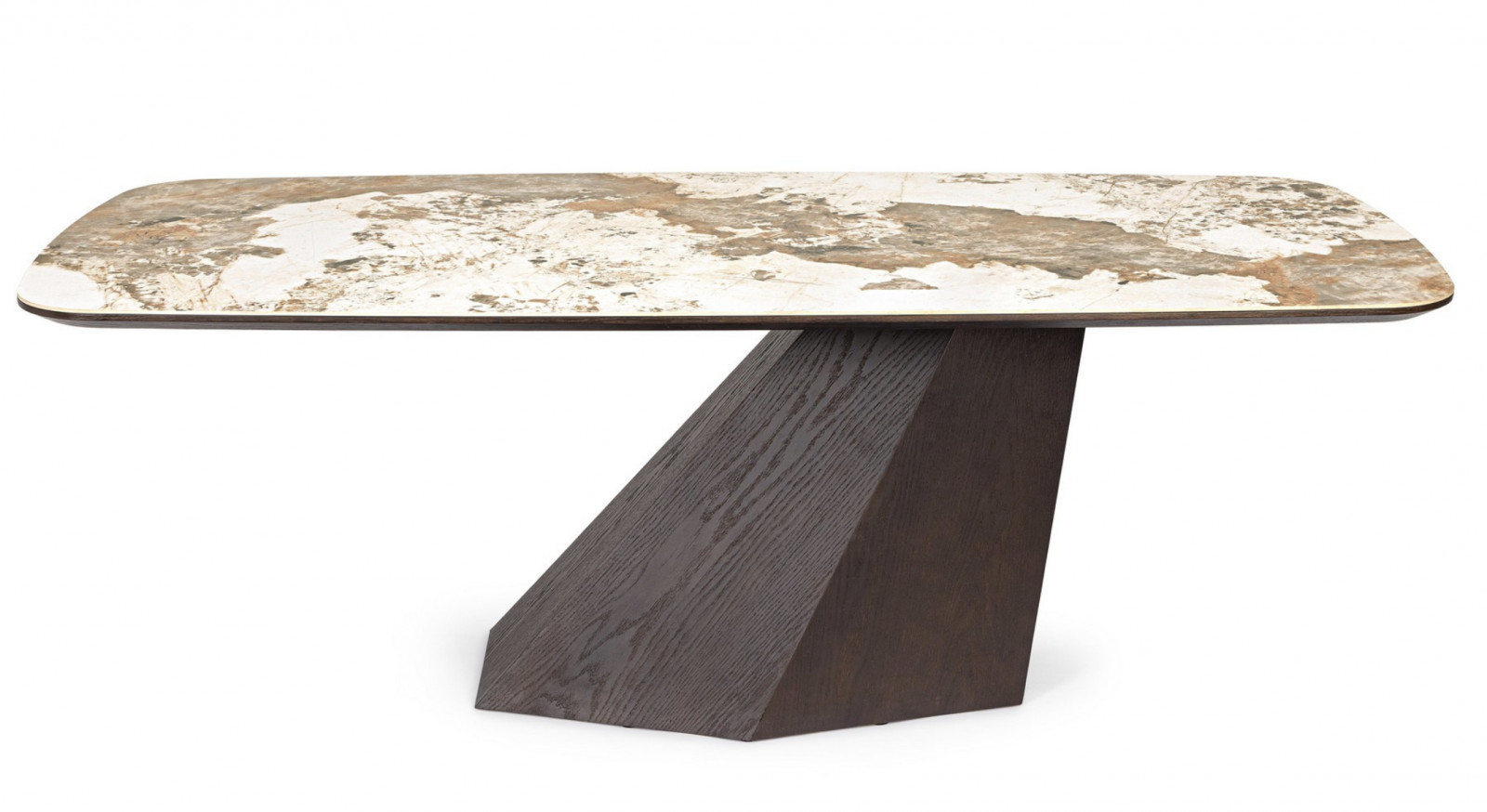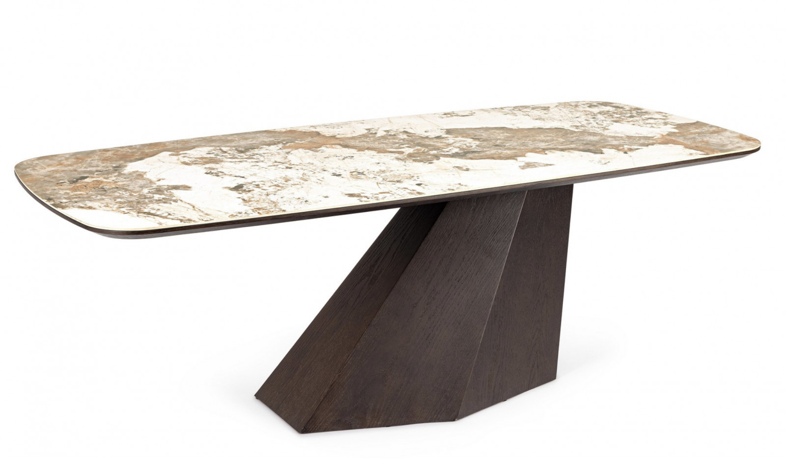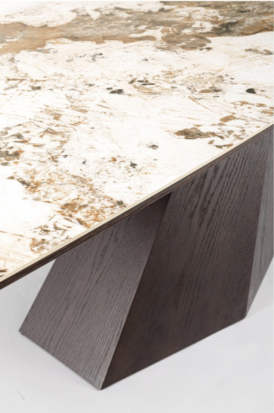 A kompozíciót a szoborszerű, döntött formájú lábazat teszi igazán különlegessé. A diófával furnérozott talp dinamikus, geometrikus kialakítása stabil tartást ad, miközben erős vizuális kontrasztot képez a világos asztallappal. Ez a megoldás modern, mégis időtálló karaktert kölcsönöz a bútornak.