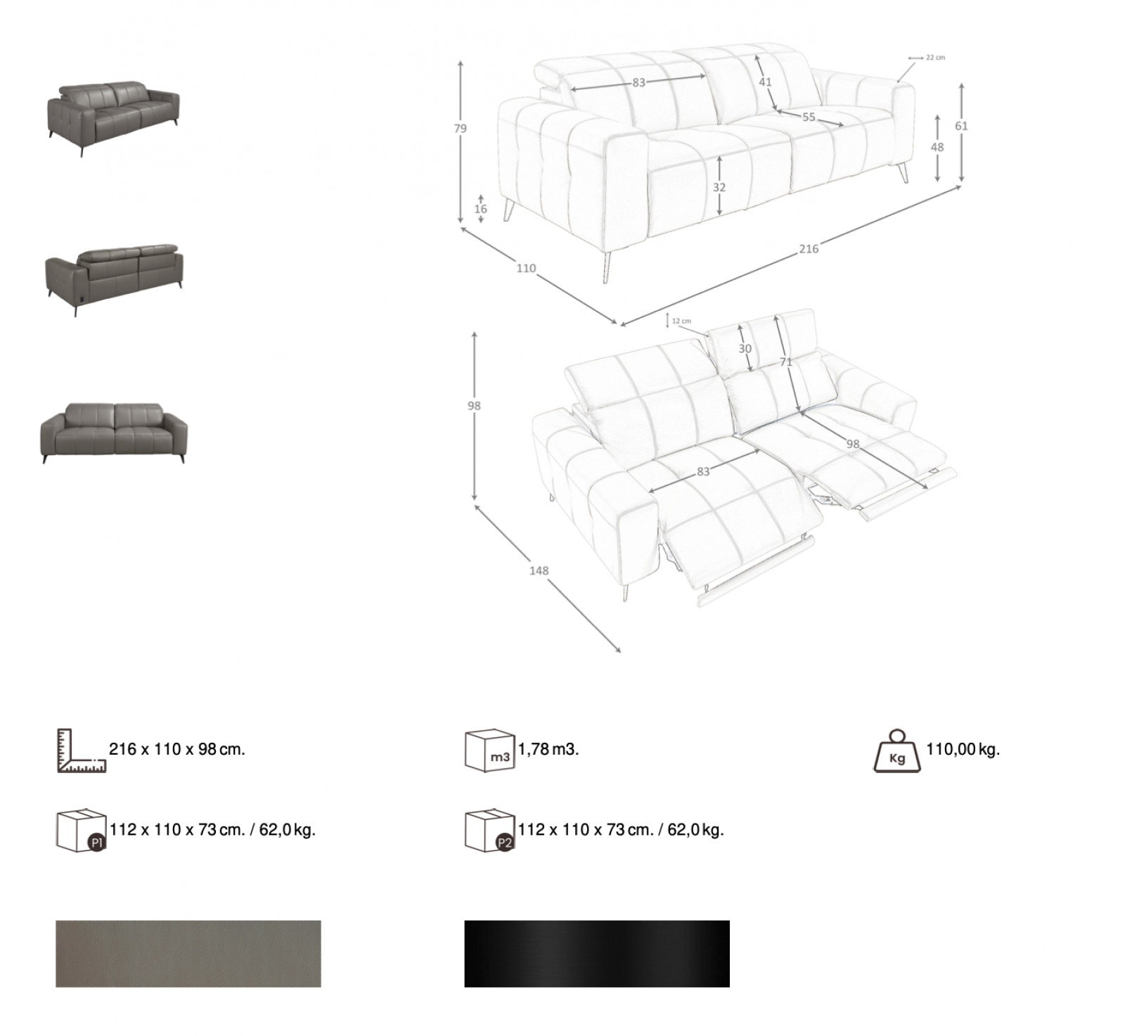 A NIETO kanapé letisztult és stílusos. A minimalista vonalvezetésű kanapét kiváló minőségű bőrrel borították tervezői, emellett nagy hangsúlyt fektettek a kényelemre, így két ülőfelülete elektromos relaxfunkcióval vannak ellátva, illetve fejtámlájuk is állítható. A relaxfunkció biztosítja, hogy beállíthassa az Ön számára legkényelmesebb pozíciót minden tevékenységhez. Exkluzív darabja lehet egy modern otthonnak vagy irodának ez a gyönyörű kanapé. A minőségi megmunkálás és anyaghasználat azonnal szembetűnik a bútordarabon, melyet spanyol designerek terveztek.