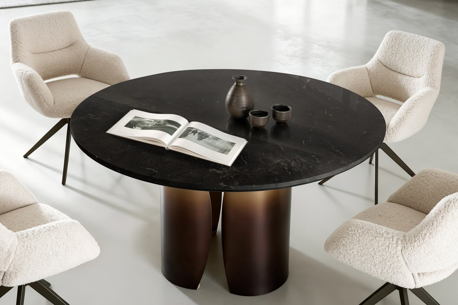 A NOLARO étkezőasztal a kortárs eleganciát és az időtálló anyaghasználatot hozza el az étkezőbe. A márvány asztallap természetes erezetével és gazdag mintázatával exkluzív, látványos fókuszpontot teremt, miközben hűvös, kifinomult eleganciát sugároz. A felület sima és könnyen tisztán tartható, így a mindennapi használat során is megőrzi lenyűgöző megjelenését.