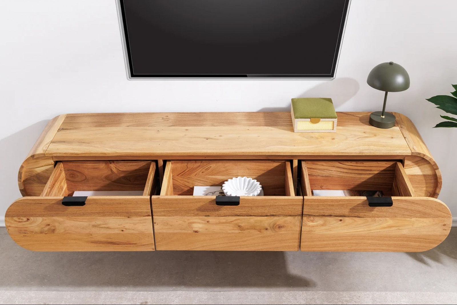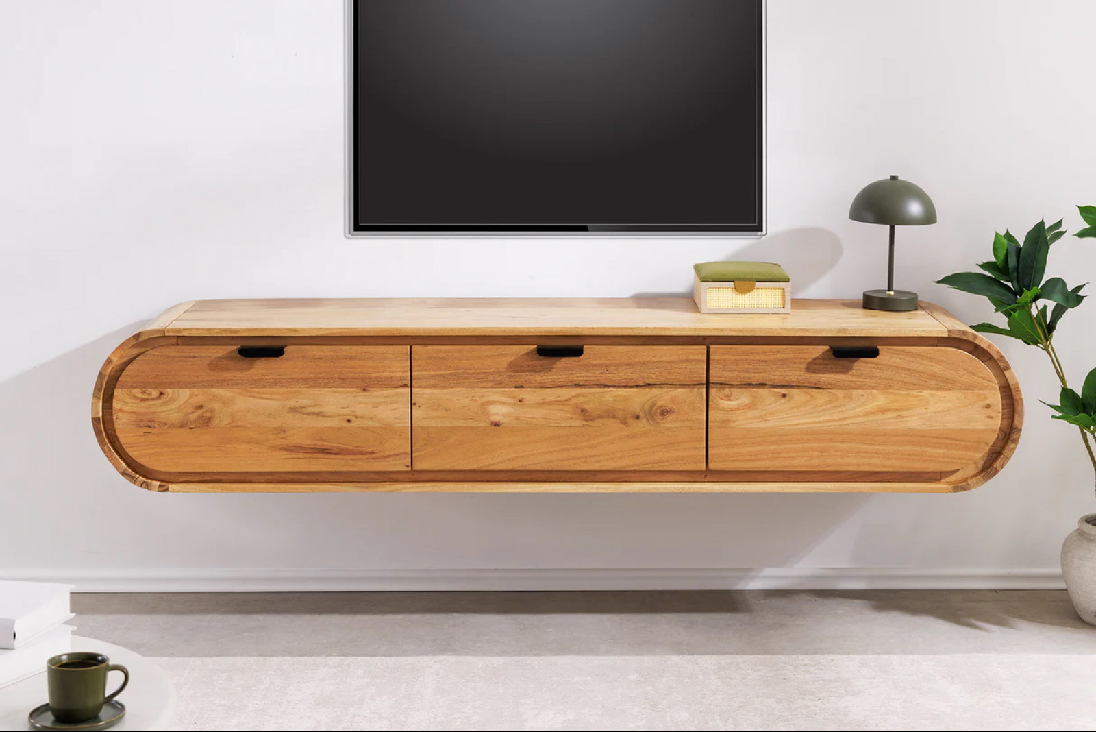 Az ORGANIC falra szerelhető TV-szekrény tömör akácfából készült, egyedi erezettel és meleg, természetes megjelenéssel. Lágyan ívelt, organikus formái harmonikusan illeszkednek a modern enteriőrbe, miközben a lebegő kialakítás könnyed, letisztult hatást kelt.