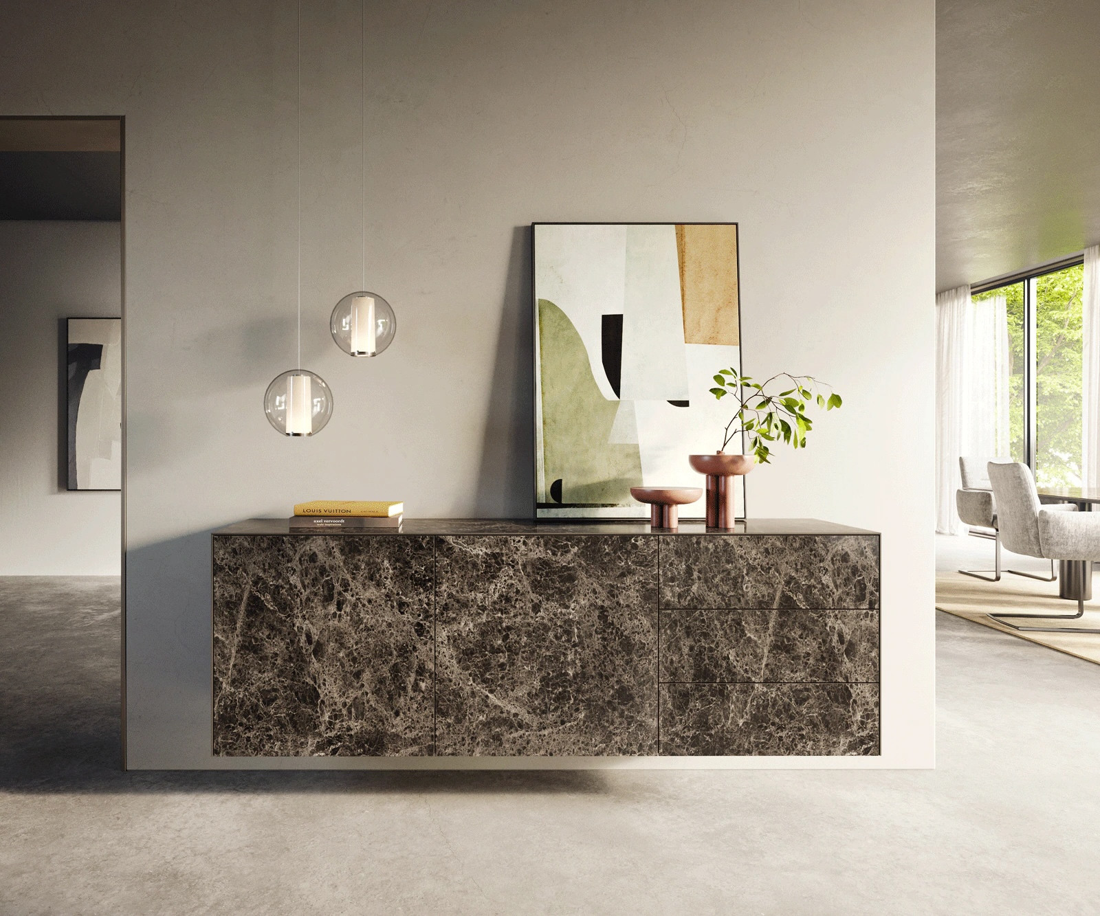 A sötétbarna, Emperador árnyalatú kerámia mély tónusai a természetes kő drámai karakterét idézik: gazdag, élénk erezetük és finoman változó fény-árnyék játéka elegáns, mégis meleg hangulatot kölcsönöz a frontoknak, így a bútor egyszerre modern és kifinomult.