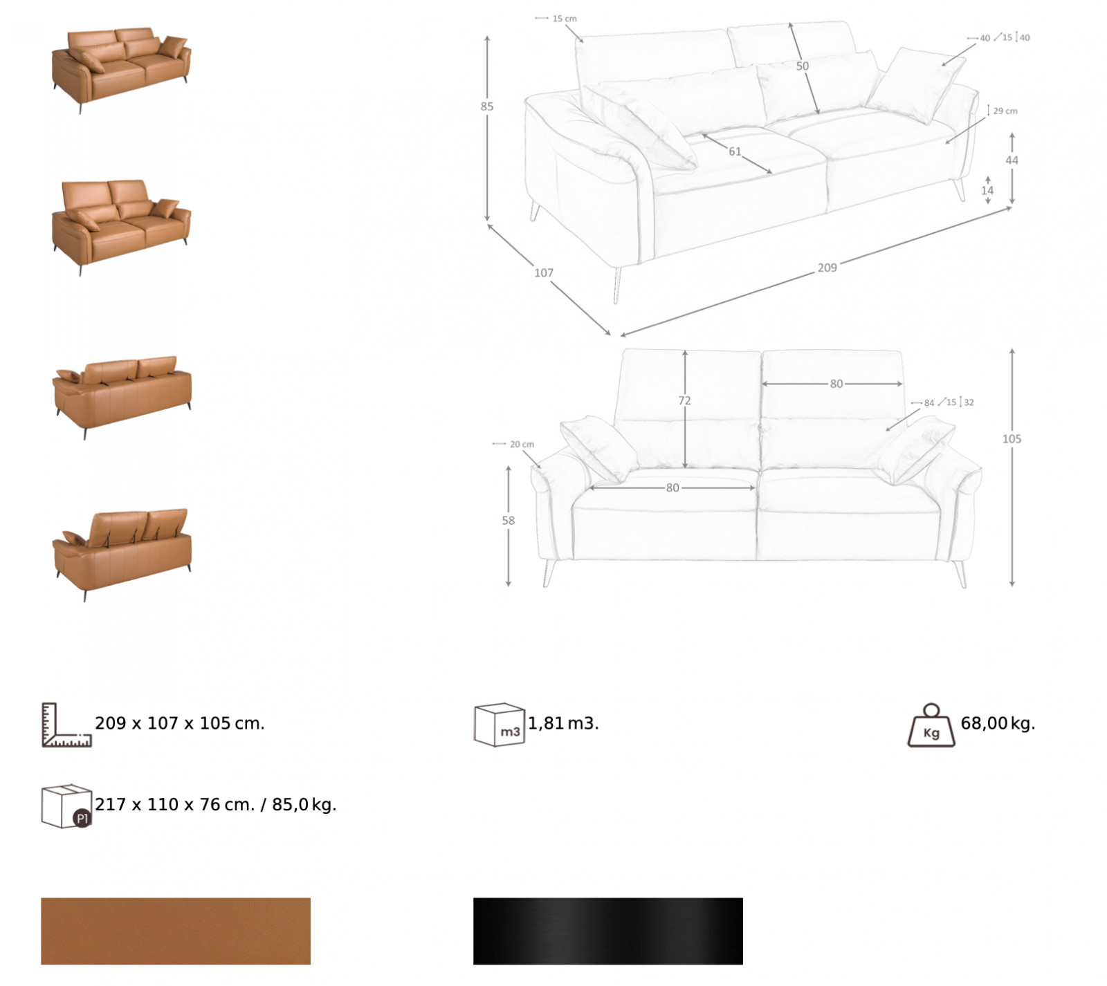 A PALOMO kanapé exkluzív és időtálló designnal rendelkezik. A minőségi marhabőrrel borított kanapé letisztult vonalait különelges részletek egészítik ki, mint a csodásan ívelő karfa és a fém lábak. A kényelemért a gazdagon párnázott ülőfelület és az állítható fejtámlák felelősek. Pompás dísze lehet modern és klasszikus otthonoknak egyaránt. A minőségi megmunkálás és anyaghasználat azonnal szembetűnik a bútordarabon, melyet spanyol designerek terveztek.
