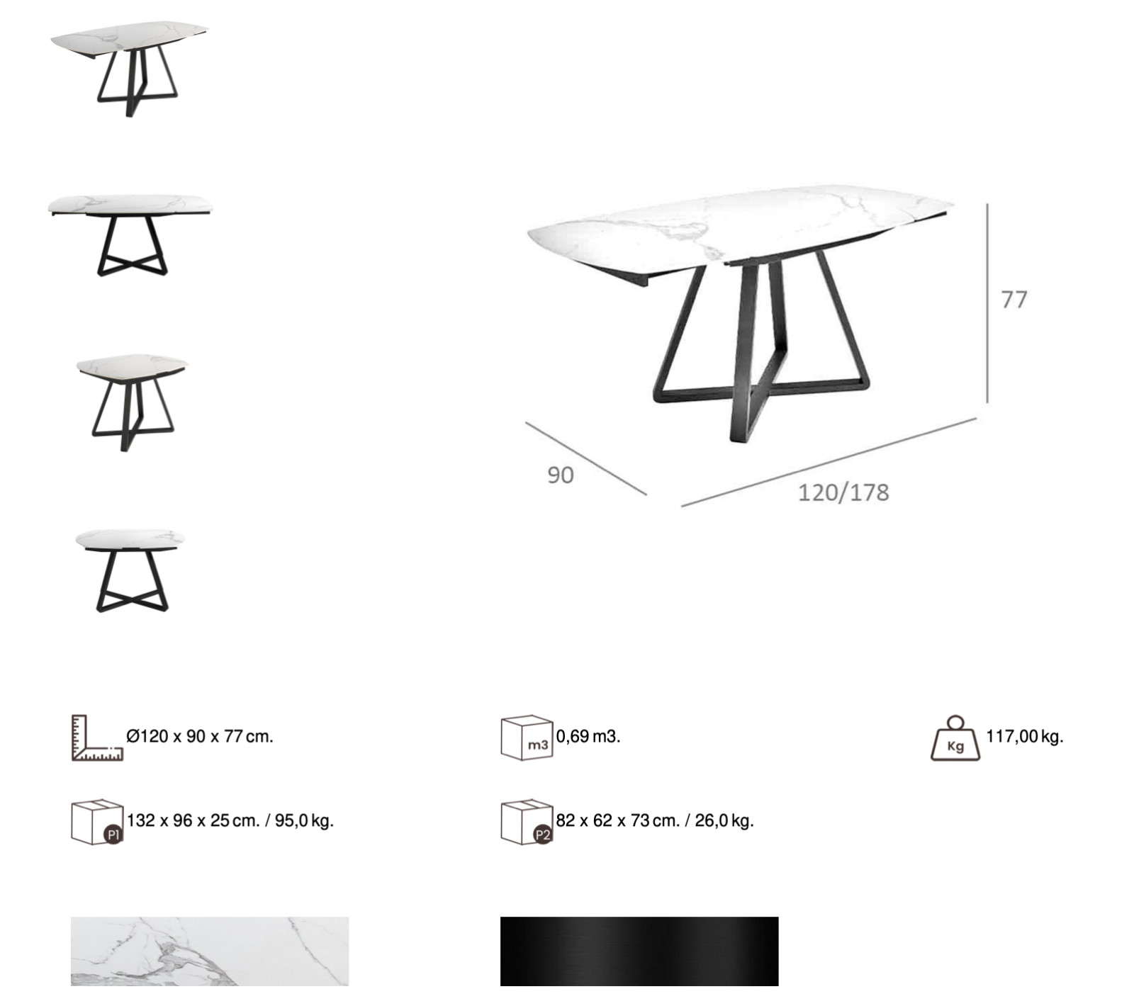 A PANILLO modern design kerámia lapos étkezőasztal fiatalos és trendi megjelenésű. Az asztallap márvány mintával ellátott kerámia, amelyet elegáns fekete színű fém lábak támasztanak alá. Különleges megjelenését a bővítő mechanizmus kialakításának köszönheti.